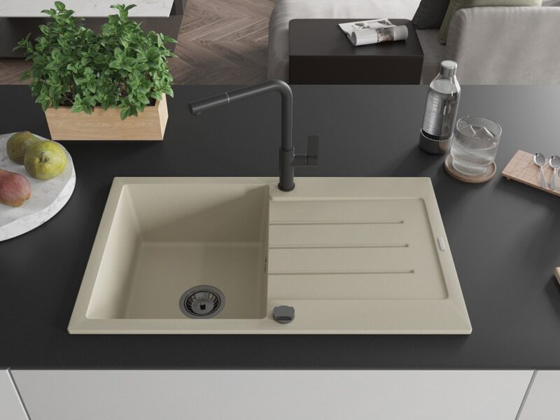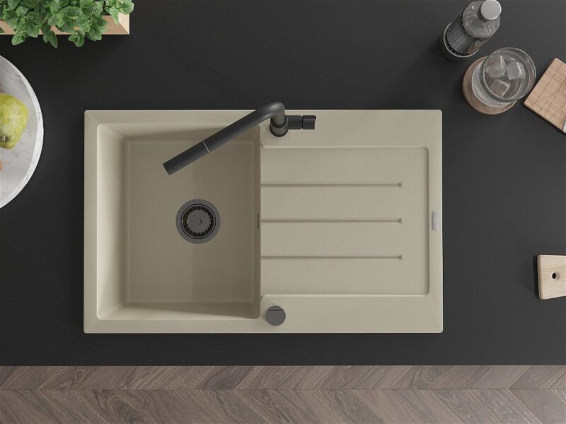 Technické dáta: drez: Rozmer: 795 x 495 x 200 mm Hĺbka komory: 200 mm Rozmery komory: 440×360 mm Priemer odtoku: ø90 mm Typ: 1-miska s odkvapkávačom Typ: Zapustené do pracovnej dosky Farba béžová Povrchová úprava sifónu: čierna Materiál: žula (80% žulové kamenivo, 20% živice) Prepadový otvor: Áno Otvory: (batérie, automatické) 2 Inštalácia: Univerzálna, je možné inštalovať s odkvapkávačom na ľavú alebo pravú stranu Vysoká odolnosť proti poškriabaniu a zmene farby Odolnosť proti tepelným šokom Ľahko čistiteľný povrch Dva dodatočné vyfrézované otvory na samodierovanie ø35 kuchynská batéria: Materiál: mosadz Čierna farba Hlava: Keramická Prevzdušňovač: Áno Typ: Jedna páka Rozsah výtoku: 245 mm Výška batérie: 307 mm(GT) Ean: 5905315061096