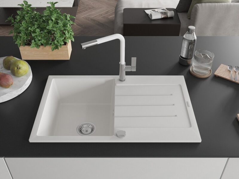 Technické dáta: drez: Rozmer: 795 x 495 x 200 mm Hĺbka komory: 200 mm Rozmery komory: 440×360 mm Priemer odtoku: ø90 mm Typ: 1-miska s odkvapkávačom Typ: Zapustené do pracovnej dosky biela farba Povrchová úprava sifónu: Chrome Materiál: žula (80% žulové kamenivo, 20% živice) Prepadový otvor: Áno Otvory: (batérie, automatické) 2 Inštalácia: Univerzálna, je možné inštalovať s odkvapkávačom na ľavú alebo pravú stranu Vysoká odolnosť proti poškriabaniu a zmene farby Odolnosť proti tepelným šokom Ľahko čistiteľný povrch Dva dodatočné vyfrézované otvory na samodierovanie ø35 kuchynská batéria: Materiál: mosadz Farba: chróm/biela Hlava: Keramická Prevzdušňovač: Áno Typ: Jedna páka Rozsah výtoku: 245 mm Výška batérie: 307 mm(GT) Ean: 5905315060969