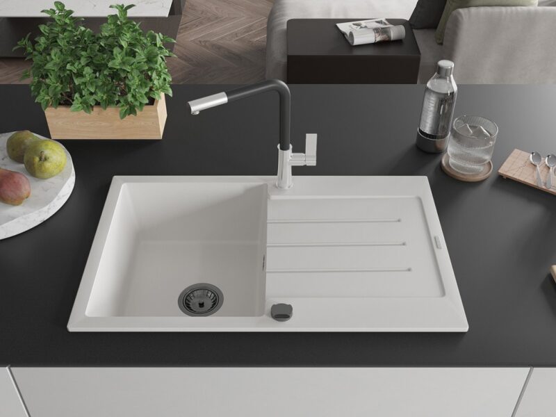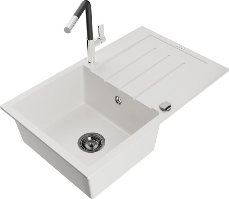 Technické dáta: drez: Rozmer: 795 x 495 x 200 mm Hĺbka komory: 200 mm Rozmery komory: 440×360 mm Priemer odtoku: ø90 mm Typ: 1-miska s odkvapkávačom Typ: Zapustené do pracovnej dosky biela farba Povrchová úprava sifónu: čierna Materiál: žula (80% žulové kamenivo, 20% živice) Prepadový otvor: Áno Otvory: (batérie, automatické) 2 Inštalácia: Univerzálna, je možné inštalovať s odkvapkávačom na ľavú alebo pravú stranu Vysoká odolnosť proti poškriabaniu a zmene farby Odolnosť proti tepelným šokom Ľahko čistiteľný povrch Dva dodatočné vyfrézované otvory na samodierovanie ø35 kuchynská batéria: Materiál: mosadz Farba: chróm/čierna Hlava: Keramická Prevzdušňovač: Áno Typ: Jedna páka Rozsah výtoku: 245 mm Výška batérie: 307 mm(GT) Ean: 5905315060990