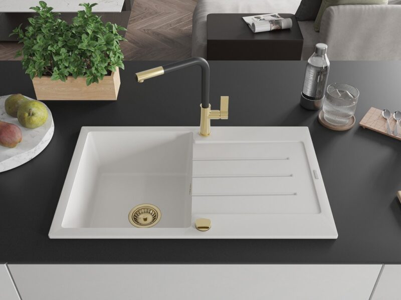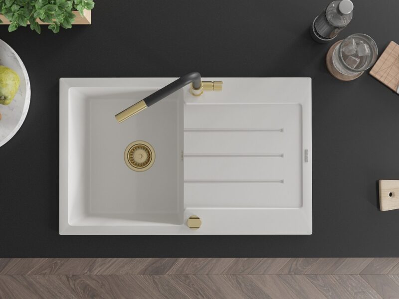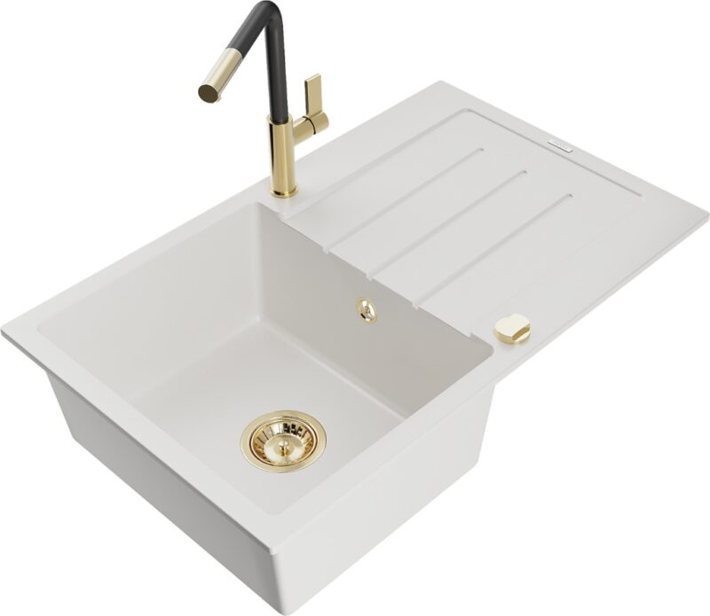 Technické dáta: drez: Rozmer: 795 x 495 x 200 mm Hĺbka komory: 200 mm Rozmery komory: 440×360 mm Priemer odtoku: ø90 mm Typ: 1-miska s odkvapkávačom Typ: Zapustené do pracovnej dosky biela farba Povrchová úprava sifónu: zlatá Materiál: žula (80% žulové kamenivo, 20% živice) Prepadový otvor: Áno Otvory: (batérie, automatické) 2 Inštalácia: Univerzálna, je možné inštalovať s odkvapkávačom na ľavú alebo pravú stranu Vysoká odolnosť proti poškriabaniu a zmene farby Odolnosť proti tepelným šokom Ľahko čistiteľný povrch Dva dodatočné vyfrézované otvory na samodierovanie ø35 kuchynská batéria: Materiál: mosadz Farba: Zlatá/Čierna Hlava: Keramická Prevzdušňovač: Áno Typ: Jedna páka Rozsah výtoku: 245 mm Výška batérie: 307 mm(GT) Ean: 5905315061003