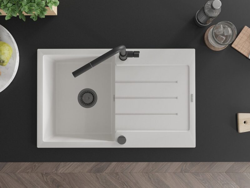 Technické dáta: drez: Rozmer: 795 x 495 x 200 mm Hĺbka komory: 200 mm Rozmery komory: 440×360 mm Priemer odtoku: ø90 mm Typ: 1-miska s odkvapkávačom Typ: Zapustené do pracovnej dosky biela farba Povrchová úprava sifónu: čierna Materiál: žula (80% žulové kamenivo, 20% živice) Prepadový otvor: Áno Otvory: (batérie, automatické) 2 Inštalácia: Univerzálna, je možné inštalovať s odkvapkávačom na ľavú alebo pravú stranu Vysoká odolnosť proti poškriabaniu a zmene farby Odolnosť proti tepelným šokom Ľahko čistiteľný povrch Dva dodatočné vyfrézované otvory na samodierovanie ø35 kuchynská batéria: Materiál: mosadz Čierna farba Hlava: Keramická Prevzdušňovač: Áno Typ: Jedna páka Rozsah výtoku: 245 mm Výška batérie: 307 mm(GT) Ean: 5905315061027
