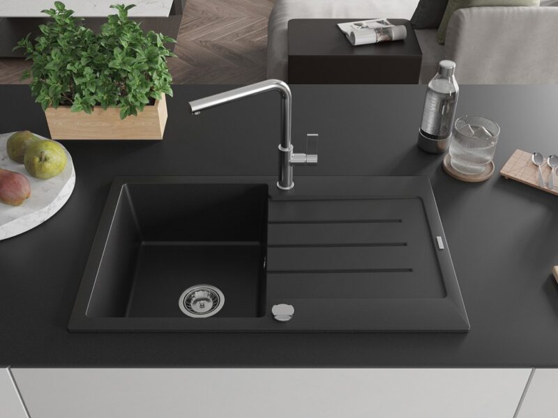 Technické dáta: drez: Rozmer: 795 x 495 x 200 mm Hĺbka komory: 200 mm Rozmery komory: 440×360 mm Priemer odtoku: ø90 mm Typ: 1-miska s odkvapkávačom Typ: Zapustené do pracovnej dosky Čierna farba Povrchová úprava sifónu: Chrome Materiál: žula (80% žulové kamenivo, 20% živice) Prepadový otvor: Áno Otvory: (batérie, automatické) 2 Inštalácia: Univerzálna, je možné inštalovať s odkvapkávačom na ľavú alebo pravú stranu Vysoká odolnosť proti poškriabaniu a zmene farby Odolnosť proti tepelným šokom Ľahko čistiteľný povrch Dva dodatočné vyfrézované otvory na samodierovanie ø35 kuchynská batéria: Materiál: mosadz Farba: Chrome Hlava: Keramická Prevzdušňovač: Áno Typ: Jedna páka Rozsah výtoku: 245 mm Výška batérie: 307 mm(GT) Ean: 5905315061393