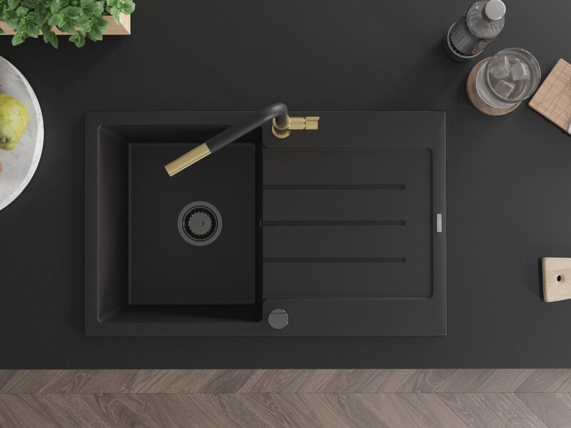 Technické dáta: drez: Rozmer: 795 x 495 x 200 mm Hĺbka komory: 200 mm Rozmery komory: 440×360 mm Priemer odtoku: ø90 mm Typ: 1-miska s odkvapkávačom Typ: Zapustené do pracovnej dosky Čierna farba Povrchová úprava sifónu: čierna Materiál: žula (80% žulové kamenivo, 20% živice) Prepadový otvor: Áno Otvory: (batérie, automatické) 2 Inštalácia: Univerzálna, je možné inštalovať s odkvapkávačom na ľavú alebo pravú stranu Vysoká odolnosť proti poškriabaniu a zmene farby Odolnosť proti tepelným šokom Ľahko čistiteľný povrch Dva dodatočné vyfrézované otvory na samodierovanie ø35 kuchynská batéria: Materiál: mosadz Farba: Zlatá/Čierna Hlava: Keramická Prevzdušňovač: Áno Typ: Jedna páka Rozsah výtoku: 245 mm Výška batérie: 307 mm(GT) Ean: 5905315061430