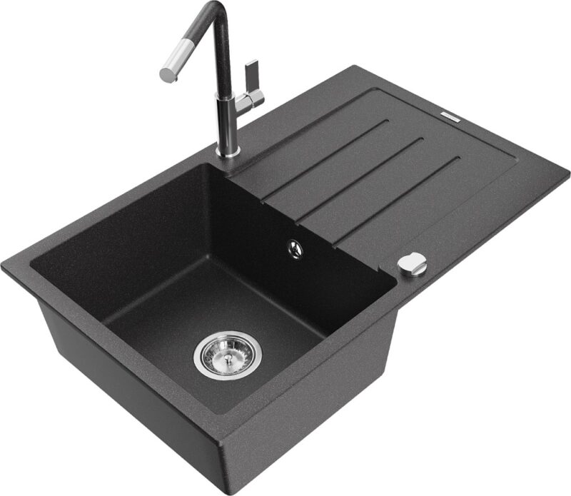 Technické dáta: drez: Rozmer: 795 x 495 x 200 mm Hĺbka komory: 200 mm Rozmery komory: 440×360 mm Priemer odtoku: ø90 mm Typ: 1-miska s odkvapkávačom Typ: Zapustené do pracovnej dosky Farba: Škvrnitá čierna Povrchová úprava sifónu: Chrome Materiál: žula (80% žulové kamenivo, 20% živice) Prepadový otvor: Áno Otvory: (batérie, automatické) 2 Inštalácia: Univerzálna, je možné inštalovať s odkvapkávačom na ľavú alebo pravú stranu Vysoká odolnosť proti poškriabaniu a zmene farby Odolnosť proti tepelným šokom Ľahko čistiteľný povrch Dva dodatočné vyfrézované otvory na samodierovanie ø35 kuchynská batéria: Materiál: mosadz Farba: chróm/čierna škvrnitá Hlava: Keramická Prevzdušňovač: Áno Typ: Jedna páka Rozsah výtoku: 245 mm Výška batérie: 307 mm(GT) Ean: 5905315061324