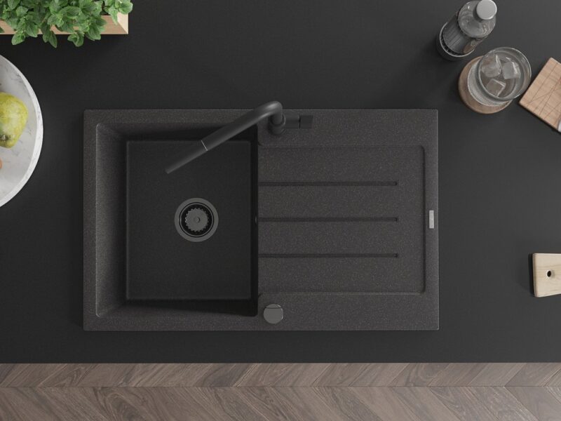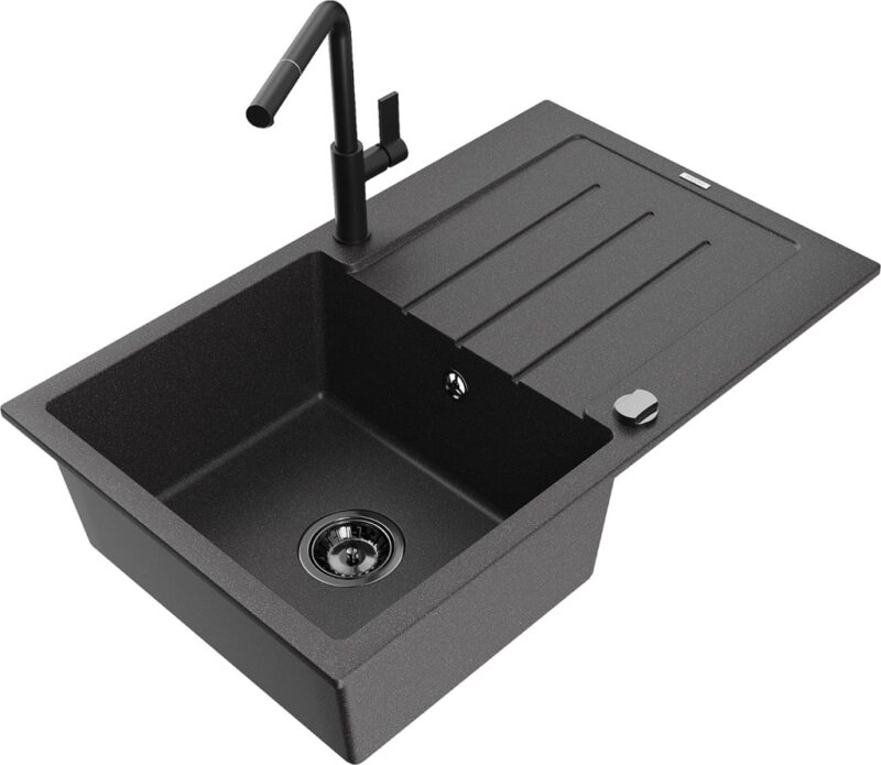 Technické dáta: drez: Rozmer: 795 x 495 x 200 mm Hĺbka komory: 200 mm Rozmery komory: 440×360 mm Priemer odtoku: ø90 mm Typ: 1-miska s odkvapkávačom Typ: Zapustené do pracovnej dosky Farba: Škvrnitá čierna Povrchová úprava sifónu: čierna Materiál: žula (80% žulové kamenivo, 20% živice) Prepadový otvor: Áno Otvory: (batérie, automatické) 2 Inštalácia: Univerzálna, je možné inštalovať s odkvapkávačom na ľavú alebo pravú stranu Vysoká odolnosť proti poškriabaniu a zmene farby Odolnosť proti tepelným šokom Ľahko čistiteľný povrch Dva dodatočné vyfrézované otvory na samodierovanie ø35 kuchynská batéria: Materiál: mosadz Čierna farba Hlava: Keramická Prevzdušňovač: Áno Typ: Jedna páka Rozsah výtoku: 245 mm Výška batérie: 307 mm(GT) Ean: 5905315061362