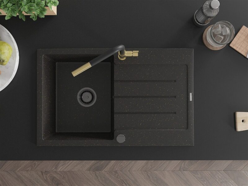 MEXEN/S MEXEN/S – Bruno granitový drez 1 s odkvapkávačom vrátane batérie Flora, čierna/zlatá metalik 6513-75-670401-57-B