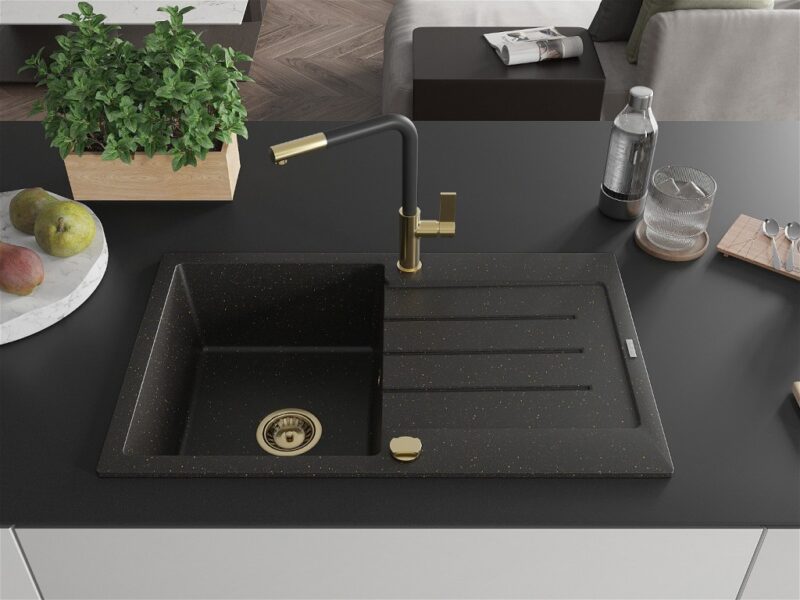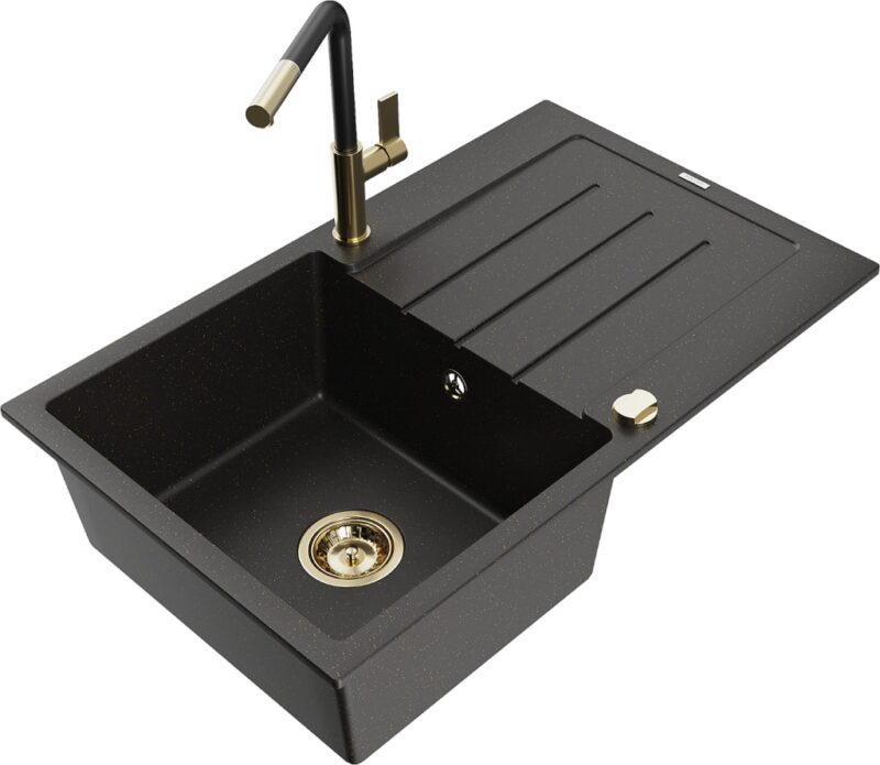 MEXEN/S MEXEN/S – Bruno granitový drez 1 s odkvapkávačom vrátane batérie Flora, čierna/zlatá metalik 6513-75-670401-57-G