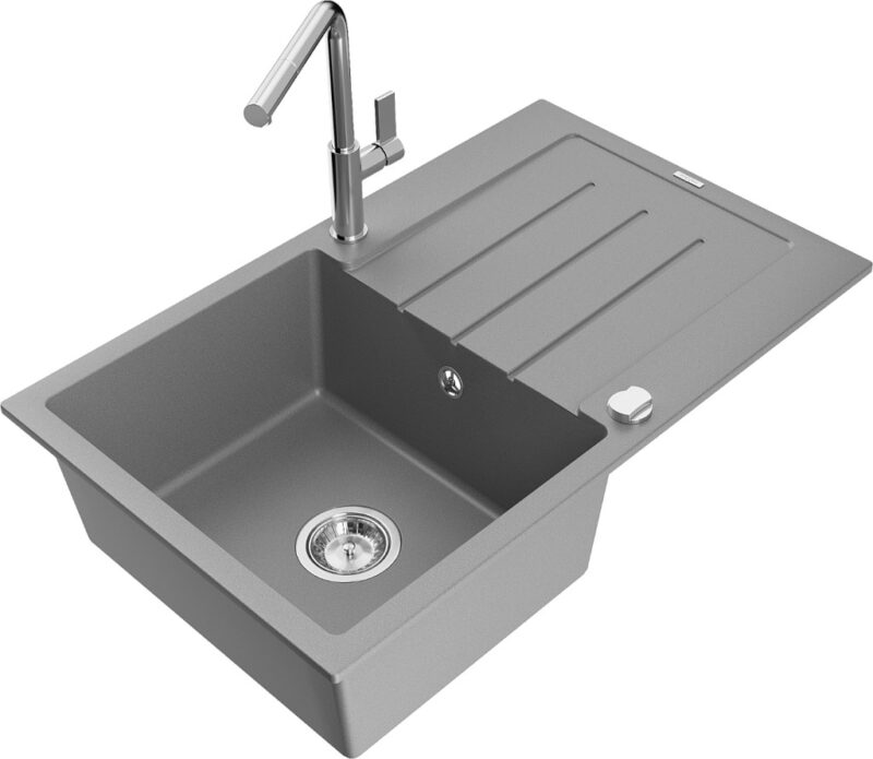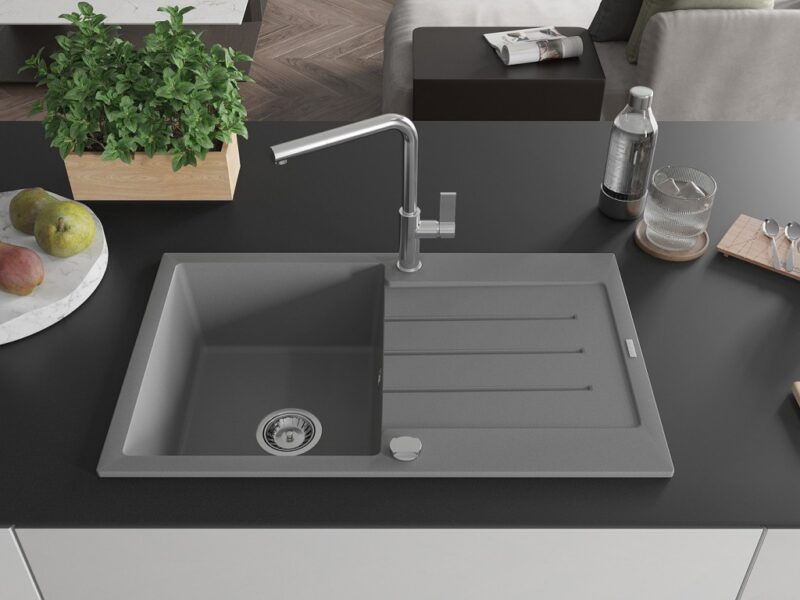 Technické dáta: drez: Rozmer: 795 x 495 x 200 mm Hĺbka komory: 200 mm Rozmery komory: 440×360 mm Priemer odtoku: ø90 mm Typ: 1-miska s odkvapkávačom Typ: Zapustené do pracovnej dosky Šedá farba Povrchová úprava sifónu: Chrome Materiál: žula (80% žulové kamenivo, 20% živice) Prepadový otvor: Áno Otvory: (batérie, automatické) 2 Inštalácia: Univerzálna, je možné inštalovať s odkvapkávačom na ľavú alebo pravú stranu Vysoká odolnosť proti poškriabaniu a zmene farby Odolnosť proti tepelným šokom Ľahko čistiteľný povrch Dva dodatočné vyfrézované otvory na samodierovanie ø35 kuchynská batéria: Materiál: mosadz Farba: Chrome Hlava: Keramická Prevzdušňovač: Áno Typ: Jedna páka Rozsah výtoku: 245 mm Výška batérie: 307 mm(GT) Ean: 5905315061102