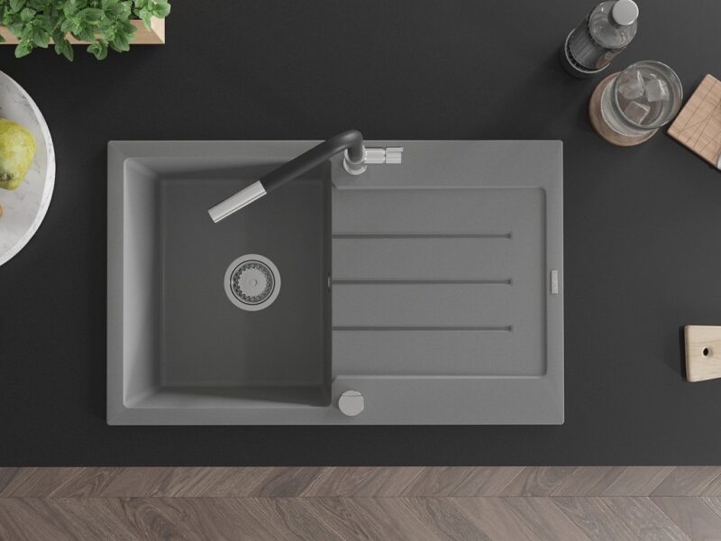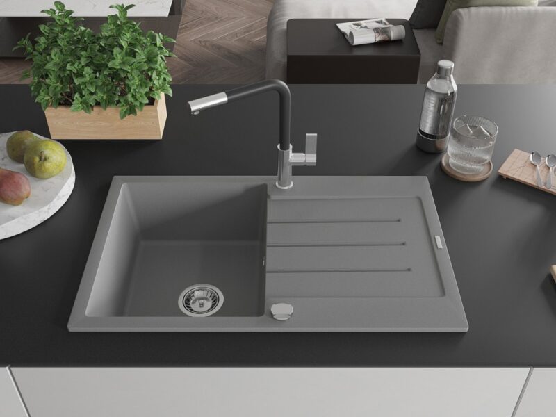 Technické dáta: drez: Rozmer: 795 x 495 x 200 mm Hĺbka komory: 200 mm Rozmery komory: 440×360 mm Priemer odtoku: ø90 mm Typ: 1-miska s odkvapkávačom Typ: Zapustené do pracovnej dosky Šedá farba Povrchová úprava sifónu: Chrome Materiál: žula (80% žulové kamenivo, 20% živice) Prepadový otvor: Áno Otvory: (batérie, automatické) 2 Inštalácia: Univerzálna, je možné inštalovať s odkvapkávačom na ľavú alebo pravú stranu Vysoká odolnosť proti poškriabaniu a zmene farby Odolnosť proti tepelným šokom Ľahko čistiteľný povrch Dva dodatočné vyfrézované otvory na samodierovanie ø35 kuchynská batéria: Materiál: mosadz Farba: chróm/čierna Hlava: Keramická Prevzdušňovač: Áno Typ: Jedna páka Rozsah výtoku: 245 mm Výška batérie: 307 mm(GT) Ean: 5905315061126