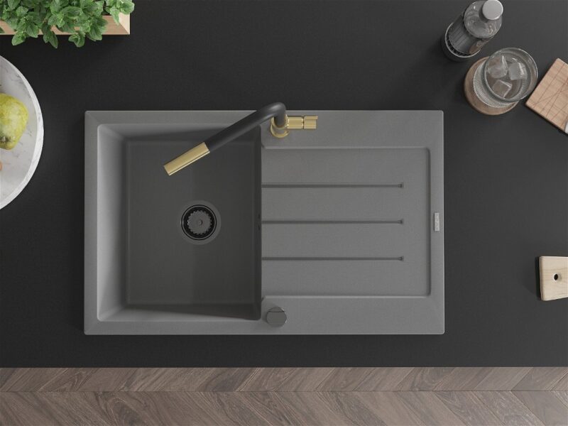 Technické dáta: drez: Rozmer: 795 x 495 x 200 mm Hĺbka komory: 200 mm Rozmery komory: 440×360 mm Priemer odtoku: ø90 mm Typ: 1-miska s odkvapkávačom Typ: Zapustené do pracovnej dosky Šedá farba Povrchová úprava sifónu: čierna Materiál: žula (80% žulové kamenivo, 20% živice) Prepadový otvor: Áno Otvory: (batérie, automatické) 2 Inštalácia: Univerzálna, je možné inštalovať s odkvapkávačom na ľavú alebo pravú stranu Vysoká odolnosť proti poškriabaniu a zmene farby Odolnosť proti tepelným šokom Ľahko čistiteľný povrch Dva dodatočné vyfrézované otvory na samodierovanie ø35 kuchynská batéria: Materiál: mosadz Farba: Zlatá/Čierna Hlava: Keramická Prevzdušňovač: Áno Typ: Jedna páka Rozsah výtoku: 245 mm Výška batérie: 307 mm(GT) Ean: 5905315061157