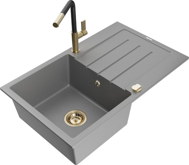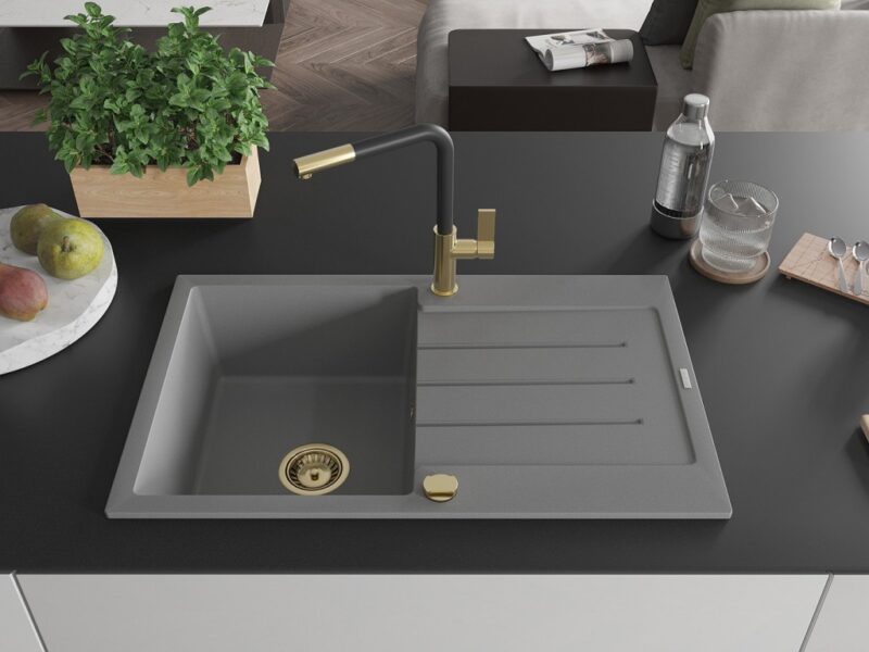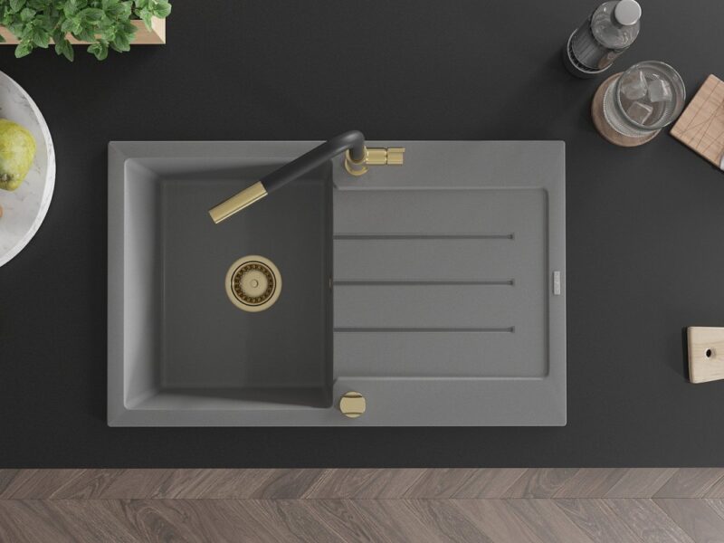 Technické dáta: drez: Rozmer: 795 x 495 x 200 mm Hĺbka komory: 200 mm Rozmery komory: 440×360 mm Priemer odtoku: ø90 mm Typ: 1-miska s odkvapkávačom Typ: Zapustené do pracovnej dosky Šedá farba Povrchová úprava sifónu: zlatá Materiál: žula (80% žulové kamenivo, 20% živice) Prepadový otvor: Áno Otvory: (batérie, automatické) 2 Inštalácia: Univerzálna, je možné inštalovať s odkvapkávačom na ľavú alebo pravú stranu Vysoká odolnosť proti poškriabaniu a zmene farby Odolnosť proti tepelným šokom Ľahko čistiteľný povrch Dva dodatočné vyfrézované otvory na samodierovanie ø35 kuchynská batéria: Materiál: mosadz Farba: Zlatá/Čierna Hlava: Keramická Prevzdušňovač: Áno Typ: Jedna páka Rozsah výtoku: 245 mm Výška batérie: 307 mm(GT) Ean: 5905315061140