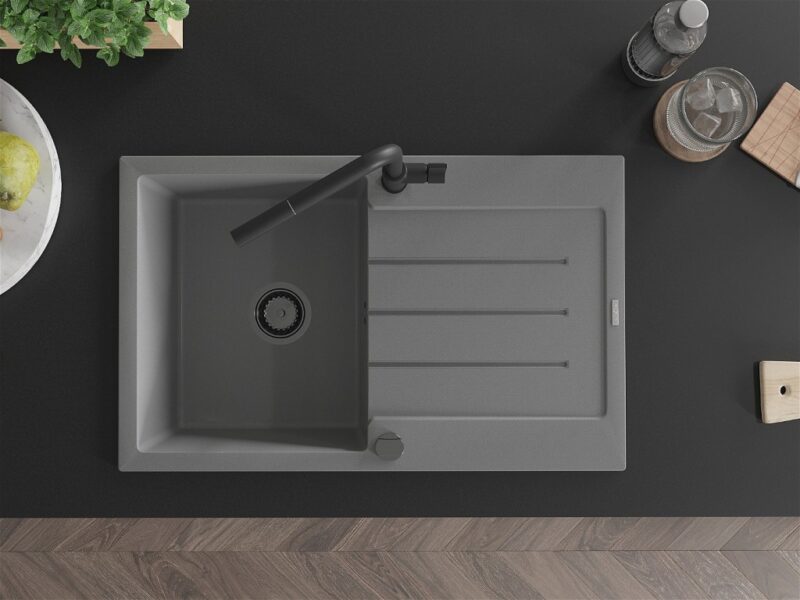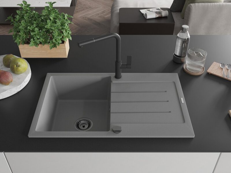 Technické dáta: drez: Rozmer: 795 x 495 x 200 mm Hĺbka komory: 200 mm Rozmery komory: 440×360 mm Priemer odtoku: ø90 mm Typ: 1-miska s odkvapkávačom Typ: Zapustené do pracovnej dosky Šedá farba Povrchová úprava sifónu: čierna Materiál: žula (80% žulové kamenivo, 20% živice) Prepadový otvor: Áno Otvory: (batérie, automatické) 2 Inštalácia: Univerzálna, je možné inštalovať s odkvapkávačom na ľavú alebo pravú stranu Vysoká odolnosť proti poškriabaniu a zmene farby Odolnosť proti tepelným šokom Ľahko čistiteľný povrch Dva dodatočné vyfrézované otvory na samodierovanie ø35 kuchynská batéria: Materiál: mosadz Čierna farba Hlava: Keramická Prevzdušňovač: Áno Typ: Jedna páka Rozsah výtoku: 245 mm Výška batérie: 307 mm(GT) Ean: 5905315061164