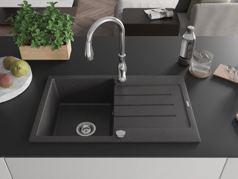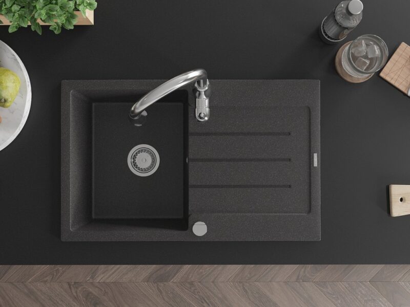 Technické dáta: drez: Rozmer: 795 x 495 x 200 mm Hĺbka komory: 200 mm Rozmery komory: 440×360 mm Priemer odtoku: ø90 mm Typ: 1-miska s odkvapkávačom Typ: Zapustené do pracovnej dosky Farba: Škvrnitá čierna Povrchová úprava sifónu: Chrome Materiál: žula (80% žulové kamenivo, 20% živice) Prepadový otvor: Áno Otvory: (batérie, automatické) 2 Inštalácia: Univerzálna, je možné inštalovať s odkvapkávačom na ľavú alebo pravú stranu Vysoká odolnosť proti poškriabaniu a zmene farby Odolnosť proti tepelným šokom Ľahko čistiteľný povrch Dva dodatočné vyfrézované otvory na samodierovanie ø35 kuchynská batéria: Materiál: mosadz Farba: Chrome Hlava: Keramická Prevzdušňovač: Áno Typ: Jedna páka Výška batérie: 410 mm Rozsah výtoku: 231 mm(GT) Ean: 5905315035660