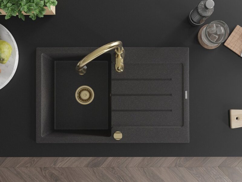 Technické dáta: drez: Rozmer: 795 x 495 x 200 mm Hĺbka komory: 200 mm Rozmery komory: 440×360 mm Priemer odtoku: ø90 mm Typ: 1-miska s odkvapkávačom Typ: Zapustené do pracovnej dosky Farba: Škvrnitá čierna Povrchová úprava sifónu: zlatá Materiál: žula (80% žulové kamenivo, 20% živice) Prepadový otvor: Áno Otvory: (batérie, automatické) 2 Inštalácia: Univerzálna, je možné inštalovať s odkvapkávačom na ľavú alebo pravú stranu Vysoká odolnosť proti poškriabaniu a zmene farby Odolnosť proti tepelným šokom Ľahko čistiteľný povrch Dva dodatočné vyfrézované otvory na samodierovanie ø35 kuchynská batéria: Materiál: mosadz Farba: Zlatá Hlava: Keramická Prevzdušňovač: Áno Typ: Jedna páka Výška batérie: 410 mm Rozsah výtoku: 231 mm(GT) Ean: 5905315035677