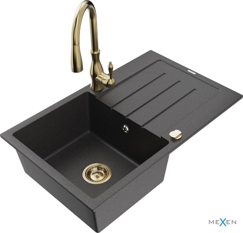 MEXEN/S MEXEN/S – Bruno granitový drez 1 s odkvapkávačom vrátane batérie Savita, čierna kropenatá 6513-76-672601-50