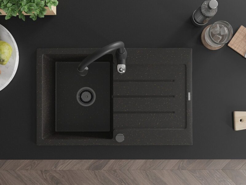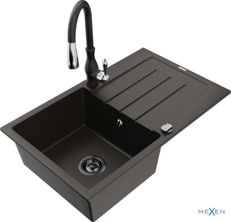 MEXEN/S MEXEN/S – Bruno granitový drez 1 s odkvapkávačom vrátane batérie Savita, čierna/zloty metalik 6513-75-672601-70-B