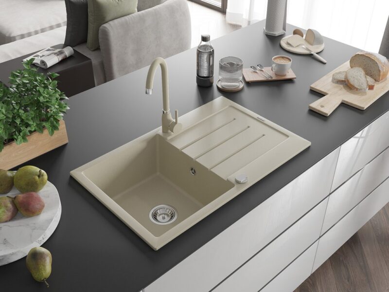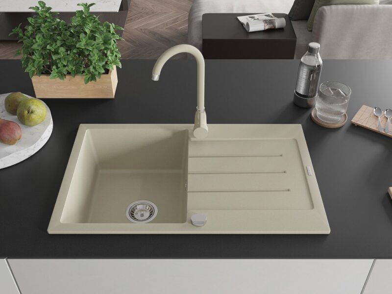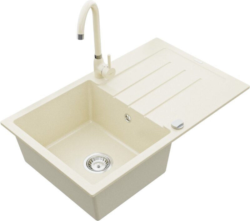 Technické dáta: drez: Rozmer: 795 x 495 x 200 mm Hĺbka komory: 200 mm Rozmery komory: 440×360 mm Priemer odtoku: ø90 mm Typ: 1-miska s odkvapkávačom Typ: Zapustené do pracovnej dosky Farba béžová Povrchová úprava sifónu: Chrome Materiál: žula (80% žulové kamenivo, 20% živice) Prepadový otvor: Áno Otvory: (batérie, automatické) 2 Inštalácia: Univerzálna, je možné inštalovať s odkvapkávačom na ľavú alebo pravú stranu Vysoká odolnosť proti poškriabaniu a zmene farby Odolnosť proti tepelným šokom Ľahko čistiteľný povrch Dva dodatočné vyfrézované otvory na samodierovanie ø35 kuchynská batéria: Materiál: mosadz Farba béžová Hlava: Keramická Prevzdušňovač: Áno Výška batérie: 335 mm Rozsah výtoku: 180 mm(GT) Ean: 5907709160644