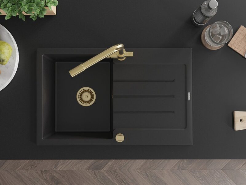 Technické dáta: drez: Rozmer: 795 x 495 x 200 mm Hĺbka komory: 200 mm Rozmery komory: 440×360 mm Priemer odtoku: ø90 mm Typ: 1-miska s odkvapkávačom Typ: Zapustené do pracovnej dosky Čierna farba Povrchová úprava sifónu: zlatá Materiál: žula (80% žulové kamenivo, 20% živice) Prepadový otvor: Áno Otvory: (batérie, automatické) 2 Inštalácia: Univerzálna, je možné inštalovať s odkvapkávačom na ľavú alebo pravú stranu Vysoká odolnosť proti poškriabaniu a zmene farby Odolnosť proti tepelným šokom Ľahko čistiteľný povrch Dva dodatočné vyfrézované otvory na samodierovanie ø35 kuchynská batéria: Materiál: mosadz Farba: Zlatá Hlava: Keramická Prevzdušňovač: Áno Typ: Dve rukoväte Rozsah výtoku: 235 mm Výška batérie: 315 mm Dvojhlavá batéria s prídavným kanálom pre filtrovanú pitnú vodu(GT) Ean: 5905315025494