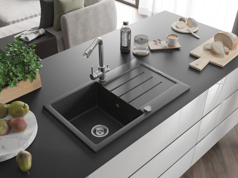 Technické dáta: drez: Rozmer: 795 x 495 x 200 mm Hĺbka komory: 200 mm Rozmery komory: 440×360 mm Priemer odtoku: ø90 mm Typ: 1-miska s odkvapkávačom Typ: Zapustené do pracovnej dosky Farba: Škvrnitá čierna Povrchová úprava sifónu: Chrome Materiál: žula (80% žulové kamenivo, 20% živice) Prepadový otvor: Áno Otvory: (batérie, automatické) 2 Inštalácia: Univerzálna, je možné inštalovať s odkvapkávačom na ľavú alebo pravú stranu Vysoká odolnosť proti poškriabaniu a zmene farby Odolnosť proti tepelným šokom Ľahko čistiteľný povrch Dva dodatočné vyfrézované otvory na samodierovanie ø35 kuchynská batéria: Materiál: mosadz Farba: Chrome Hlava: Keramická Prevzdušňovač: Áno Typ: Dve rukoväte Rozsah výtoku: 235 mm Výška batérie: 315 mm Dvojhlavá batéria s prídavným kanálom pre filtrovanú pitnú vodu(GT) Ean: 5905315025432