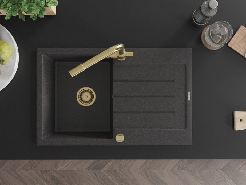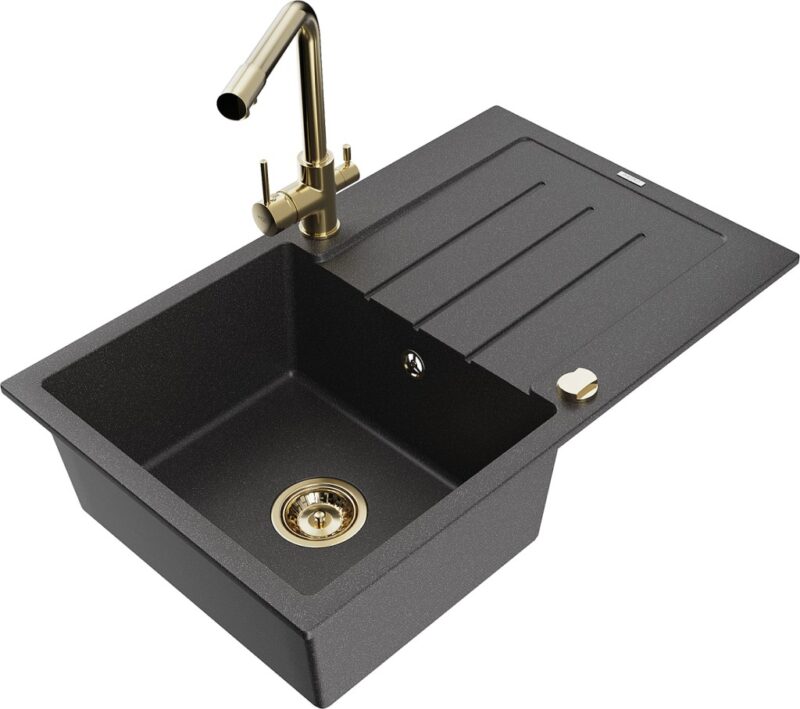 Technické dáta: drez: Rozmer: 795 x 495 x 200 mm Hĺbka komory: 200 mm Rozmery komory: 440×360 mm Priemer odtoku: ø90 mm Typ: 1-miska s odkvapkávačom Typ: Zapustené do pracovnej dosky Farba: Škvrnitá čierna Povrchová úprava sifónu: zlatá Materiál: žula (80% žulové kamenivo, 20% živice) Prepadový otvor: Áno Otvory: (batérie, automatické) 2 Inštalácia: Univerzálna, je možné inštalovať s odkvapkávačom na ľavú alebo pravú stranu Vysoká odolnosť proti poškriabaniu a zmene farby Odolnosť proti tepelným šokom Ľahko čistiteľný povrch Dva dodatočné vyfrézované otvory na samodierovanie ø35 kuchynská batéria: Materiál: mosadz Farba: Zlatá Hlava: Keramická Prevzdušňovač: Áno Typ: Dve rukoväte Rozsah výtoku: 235 mm Výška batérie: 315 mm Dvojhlavá batéria s prídavným kanálom pre filtrovanú pitnú vodu(GT) Ean: 5905315025449