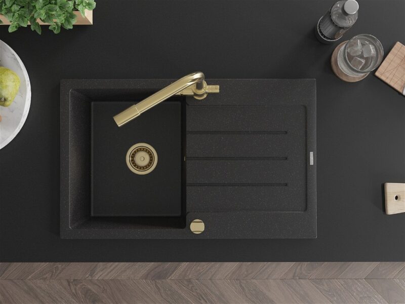 Technické dáta: drez: Rozmer: 795 x 495 x 200 mm Hĺbka komory: 200 mm Rozmery komory: 440×360 mm Priemer odtoku: ø90 mm Typ: 1-miska s odkvapkávačom Typ: Zapustené do pracovnej dosky Farba: čierna/strieborná metalíza Povrchová úprava sifónu: zlatá Materiál: žula (80% žulové kamenivo, 20% živice) Prepadový otvor: Áno Otvory: (batérie, automatické) 2 Inštalácia: Univerzálna, je možné inštalovať s odkvapkávačom na ľavú alebo pravú stranu Vysoká odolnosť proti poškriabaniu a zmene farby Odolnosť proti tepelným šokom Ľahko čistiteľný povrch Dva dodatočné vyfrézované otvory na samodierovanie ø35 kuchynská batéria: Materiál: mosadz Farba: Zlatá Hlava: Keramická Prevzdušňovač: Áno Typ: Dve rukoväte Rozsah výtoku: 235 mm Výška batérie: 315 mm Dvojhlavá batéria s prídavným kanálom pre filtrovanú pitnú vodu(GT) Ean: 5905315025357