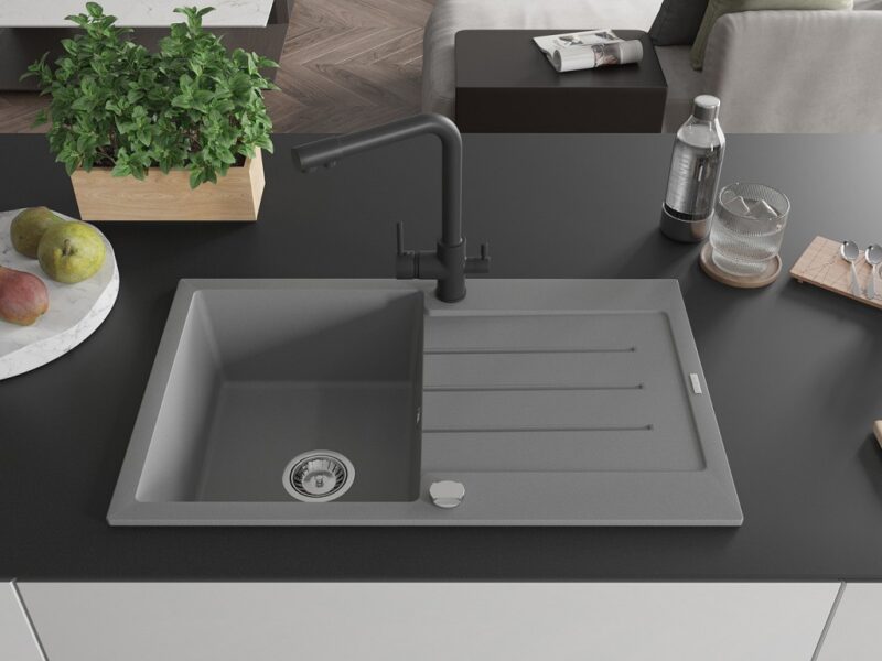 Technické dáta: drez: Rozmer: 795 x 495 x 200 mm Hĺbka komory: 200 mm Rozmery komory: 440×360 mm Priemer odtoku: ø90 mm Typ: 1-miska s odkvapkávačom Typ: Zapustené do pracovnej dosky Šedá farba Povrchová úprava sifónu: Chrome Materiál: žula (80% žulové kamenivo, 20% živice) Prepadový otvor: Áno Otvory: (batérie, automatické) 2 Inštalácia: Univerzálna, je možné inštalovať s odkvapkávačom na ľavú alebo pravú stranu Vysoká odolnosť proti poškriabaniu a zmene farby Odolnosť proti tepelným šokom Ľahko čistiteľný povrch Dva dodatočné vyfrézované otvory na samodierovanie ø35 kuchynská batéria: Materiál: mosadz Čierna farba Hlava: Keramická Prevzdušňovač: Áno Typ: Dve rukoväte Rozsah výtoku: 235 mm Výška batérie: 315 mm Dvojhlavá batéria s prídavným kanálom pre filtrovanú pitnú vodu(GT) Ean: 5905315025319