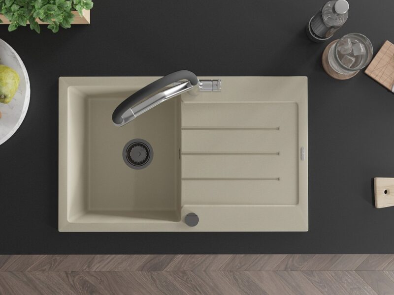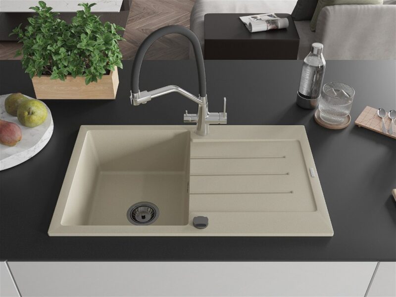Technické dáta: drez: Rozmer: 795 x 495 x 200 mm Hĺbka komory: 200 mm Rozmery komory: 440×360 mm Priemer odtoku: ø90 mm Typ: 1-miska s odkvapkávačom Typ: Zapustené do pracovnej dosky Farba béžová Povrchová úprava sifónu: čierna Materiál: žula (80% žulové kamenivo, 20% živice) Prepadový otvor: Áno Otvory: (batérie, automatické) 2 Inštalácia: Univerzálna, je možné inštalovať s odkvapkávačom na ľavú alebo pravú stranu Vysoká odolnosť proti poškriabaniu a zmene farby Odolnosť proti tepelným šokom Ľahko čistiteľný povrch Dva dodatočné vyfrézované otvory na samodierovanie ø35 kuchynská batéria: Materiál: mosadz Farba: chróm/čierna Hlavy: Keramické Prevzdušňovač: Áno Typ hubica: Flexibilný s mosadzným držiakom Rozsah výtoku: 260 mm Výška: 405 mm Typ: Dve rukoväte Dvojhlavá batéria s prídavným filtrom na pitnú vodu(GT) Ean: 5905315101952