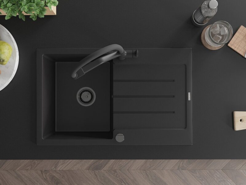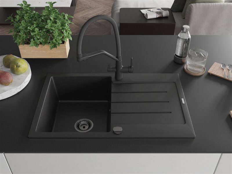 Technické dáta: drez: Rozmer: 795 x 495 x 200 mm Hĺbka komory: 200 mm Rozmery komory: 440×360 mm Priemer odtoku: ø90 mm Typ: 1-miska s odkvapkávačom Typ: Zapustené do pracovnej dosky Čierna farba Povrchová úprava sifónu: čierna Materiál: žula (80% žulové kamenivo, 20% živice) Prepadový otvor: Áno Otvory: (batérie, automatické) 2 Inštalácia: Univerzálna, je možné inštalovať s odkvapkávačom na ľavú alebo pravú stranu Vysoká odolnosť proti poškriabaniu a zmene farby Odolnosť proti tepelným šokom Ľahko čistiteľný povrch Dva dodatočné vyfrézované otvory na samodierovanie ø35 kuchynská batéria: Materiál: mosadz Čierna farba Hlavy: Keramické Prevzdušňovač: Áno Typ hubica: Flexibilný s mosadzným držiakom Rozsah výtoku: 260 mm Výška: 405 mm Typ: Dve rukoväte Dvojhlavá batéria s prídavným filtrom na pitnú vodu(GT) Ean: 5905315102232