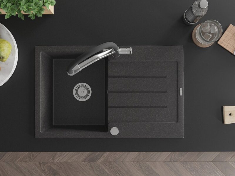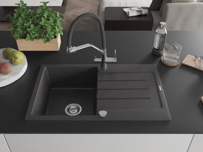 Technické dáta: drez: Rozmer: 795 x 495 x 200 mm Hĺbka komory: 200 mm Rozmery komory: 440×360 mm Priemer odtoku: ø90 mm Typ: 1-miska s odkvapkávačom Typ: Zapustené do pracovnej dosky Farba: Škvrnitá čierna Povrchová úprava sifónu: Chrome Materiál: žula (80% žulové kamenivo, 20% živice) Prepadový otvor: Áno Otvory: (batérie, automatické) 2 Inštalácia: Univerzálna, je možné inštalovať s odkvapkávačom na ľavú alebo pravú stranu Vysoká odolnosť proti poškriabaniu a zmene farby Odolnosť proti tepelným šokom Ľahko čistiteľný povrch Dva dodatočné vyfrézované otvory na samodierovanie ø35 kuchynská batéria: Materiál: mosadz Farba: chróm/čierna Hlavy: Keramické Prevzdušňovač: Áno Typ hubica: Flexibilný s mosadzným držiakom Rozsah výtoku: 260 mm Výška: 405 mm Typ: Dve rukoväte Dvojhlavá batéria s prídavným filtrom na pitnú vodu(GT) Ean: 5905315102140