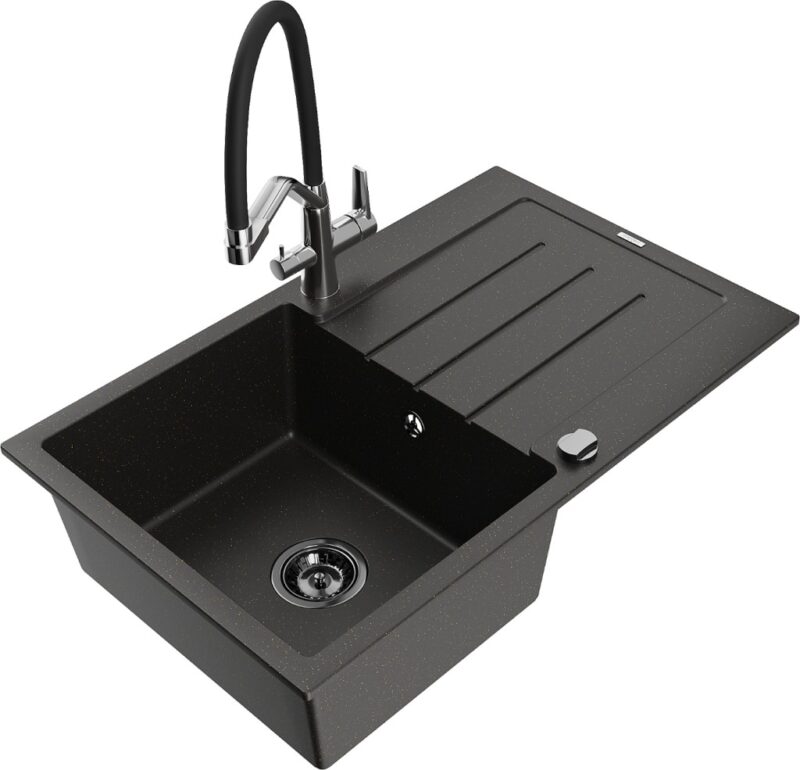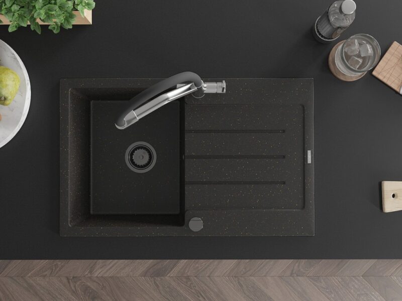 Technické dáta: drez: Rozmer: 795 x 495 x 200 mm Hĺbka komory: 200 mm Rozmery komory: 440×360 mm Priemer odtoku: ø90 mm Typ: 1-miska s odkvapkávačom Typ: Zapustené do pracovnej dosky Farba: čierna / zlatá metalíza Povrchová úprava sifónu: čierna Materiál: žula (80% žulové kamenivo, 20% živice) Prepadový otvor: Áno Otvory: (batérie, automatické) 2 Inštalácia: Univerzálna, je možné inštalovať s odkvapkávačom na ľavú alebo pravú stranu Vysoká odolnosť proti poškriabaniu a zmene farby Odolnosť proti tepelným šokom Ľahko čistiteľný povrch Dva dodatočné vyfrézované otvory na samodierovanie ø35 kuchynská batéria: Materiál: mosadz Farba: chróm/čierna Hlavy: Keramické Prevzdušňovač: Áno Typ hubica: Flexibilný s mosadzným držiakom Rozsah výtoku: 260 mm Výška: 405 mm Typ: Dve rukoväte Dvojhlavá batéria s prídavným filtrom na pitnú vodu(GT) Ean: 5905315102102