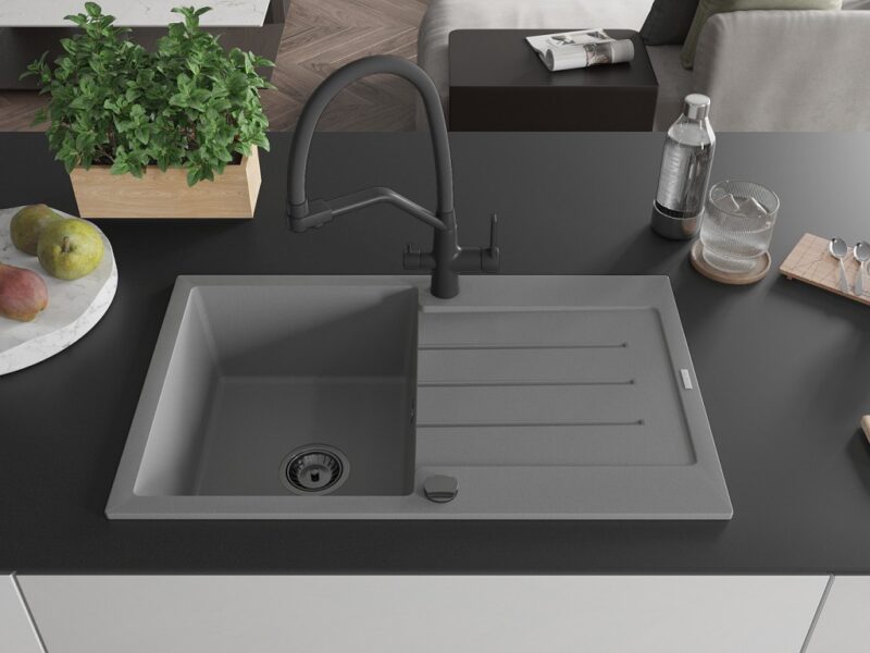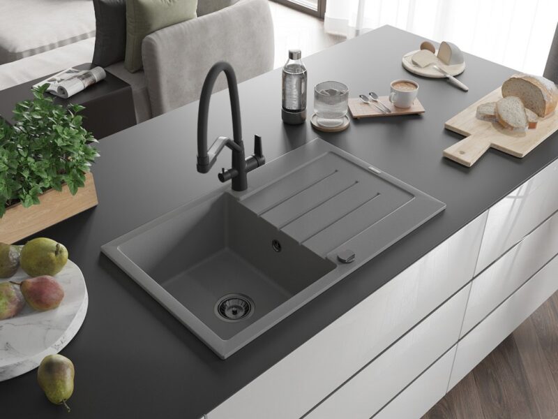 Technické dáta: drez: Rozmer: 795 x 495 x 200 mm Hĺbka komory: 200 mm Rozmery komory: 440×360 mm Priemer odtoku: ø90 mm Typ: 1-miska s odkvapkávačom Typ: Zapustené do pracovnej dosky Šedá farba Povrchová úprava sifónu: čierna Materiál: žula (80% žulové kamenivo, 20% živice) Prepadový otvor: Áno Otvory: (batérie, automatické) 2 Inštalácia: Univerzálna, je možné inštalovať s odkvapkávačom na ľavú alebo pravú stranu Vysoká odolnosť proti poškriabaniu a zmene farby Odolnosť proti tepelným šokom Ľahko čistiteľný povrch Dva dodatočné vyfrézované otvory na samodierovanie ø35 kuchynská batéria: Materiál: mosadz Čierna farba Hlavy: Keramické Prevzdušňovač: Áno Typ hubica: Flexibilný s mosadzným držiakom Rozsah výtoku: 260 mm Výška: 405 mm Typ: Dve rukoväte Dvojhlavá batéria s prídavným filtrom na pitnú vodu(GT) Ean: 5905315102034
