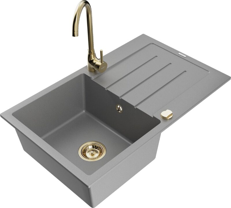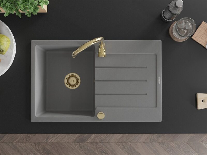 Technické dáta: drez: Rozmer: 795 x 495 x 200 mm Hĺbka komory: 200 mm Rozmery komory: 440×360 mm Priemer odtoku: ø90 mm Typ: 1-miska s odkvapkávačom Typ: Zapustené do pracovnej dosky Šedá farba Povrchová úprava sifónu: zlatá Materiál: žula (80% žulové kamenivo, 20% živice) Prepadový otvor: Áno Otvory: (batérie, automatické) 2 Inštalácia: Univerzálna, je možné inštalovať s odkvapkávačom na ľavú alebo pravú stranu Vysoká odolnosť proti poškriabaniu a zmene farby Odolnosť proti tepelným šokom Ľahko čistiteľný povrch Dva dodatočné vyfrézované otvory na samodierovanie ø35 kuchynská batéria: Materiál: mosadz Farba: Zlatá Hlava: Keramická Prevzdušňovač: Áno Typ: Jedna páka Výška batérie: 335 mm Rozsah výtoku: 180 mm(GT) Ean: 5905315015464