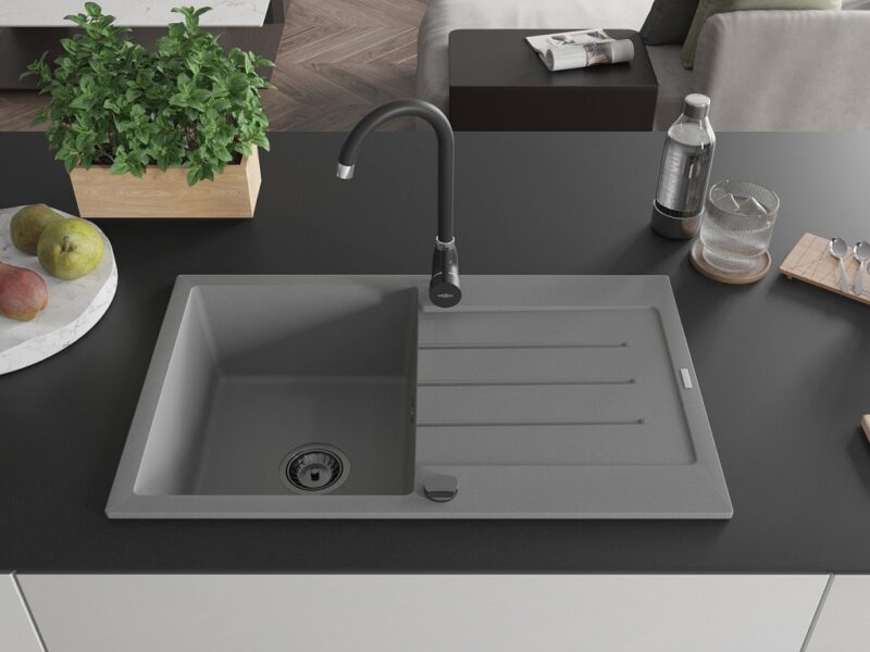 Technické dáta: drez: Rozmer: 795 x 495 x 200 mm Hĺbka komory: 200 mm Rozmery komory: 440×360 mm Priemer odtoku: ø90 mm Typ: 1-miska s odkvapkávačom Typ: Zapustené do pracovnej dosky Šedá farba Povrchová úprava sifónu: čierna Materiál: žula (80% žulové kamenivo, 20% živice) Prepadový otvor: Áno Otvory: (batérie, automatické) 2 Inštalácia: Univerzálna, je možné inštalovať s odkvapkávačom na ľavú alebo pravú stranu Vysoká odolnosť proti poškriabaniu a zmene farby Odolnosť proti tepelným šokom Ľahko čistiteľný povrch Dva dodatočné vyfrézované otvory na samodierovanie ø35 kuchynská batéria: Materiál: mosadz Čierna farba Hlava: Keramická Prevzdušňovač: Áno Typ: Jedna páka Výška batérie: 335 mm Rozsah výtoku: 180 mm(GT) Ean: 5905315015488