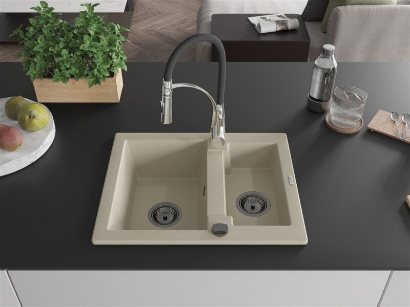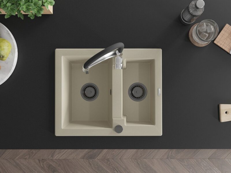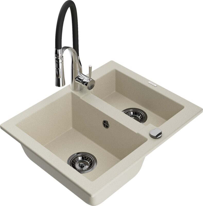 Technické dáta: drez: Rozmer: 582 x 475 x 177 mm Hĺbka komory: 162 mm (väčšia), 102 mm (menšia) Rozmery komory: 395×272 mm (väčšie), 375×182 mm (menšie) Priemer odtoku: ø90 mm Typ: 1,5 komory Typ: Zapustené do pracovnej dosky Farba béžová Povrchová úprava sifónu: čierna Materiál: žula (80% žulové kamenivo, 20% živice) Prepadový otvor: Áno Otvory: (batérie, automatické) 2 Vysoká odolnosť proti poškriabaniu a zmene farby Odolnosť proti tepelným šokom Ľahko čistiteľný povrch Jeden dodatočný vyfrézovaný otvor na samodierovanie ø35 kuchynská batéria: Materiál: mosadz Farba: chróm/čierna Hlava: Keramická Prevzdušňovač: Áno Typ: Jedna páka Výška batérie: 430 mm Rozsah výtoku: 185 mm Batéria má výsuvný výtok(GT) Ean: 5905315048899