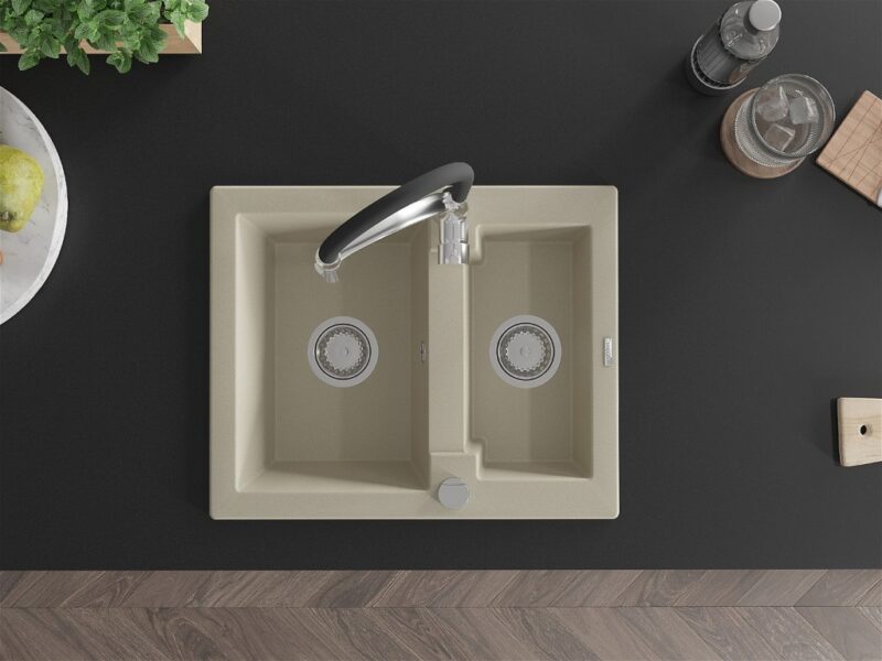 Technické dáta: drez: Rozmer: 582 x 475 x 177 mm Hĺbka komory: 162 mm (väčšia), 102 mm (menšia) Rozmery komory: 395×272 mm (väčšie), 375×182 mm (menšie) Priemer odtoku: ø90 mm Typ: 1,5 komory Typ: Zapustené do pracovnej dosky Farba béžová Povrchová úprava sifónu: Chrome Materiál: žula (80% žulové kamenivo, 20% živice) Prepadový otvor: Áno Otvory: (batérie, automatické) 2 Vysoká odolnosť proti poškriabaniu a zmene farby Odolnosť proti tepelným šokom Ľahko čistiteľný povrch Jeden dodatočný vyfrézovaný otvor na samodierovanie ø35 kuchynská batéria: Materiál: mosadz Farba: chróm/čierna Hlava: Keramická Prevzdušňovač: Áno Typ: Jedna páka Výška batérie: 430 mm Rozsah výtoku: 185 mm Batéria má výsuvný výtok(GT) Ean: 5905315048882