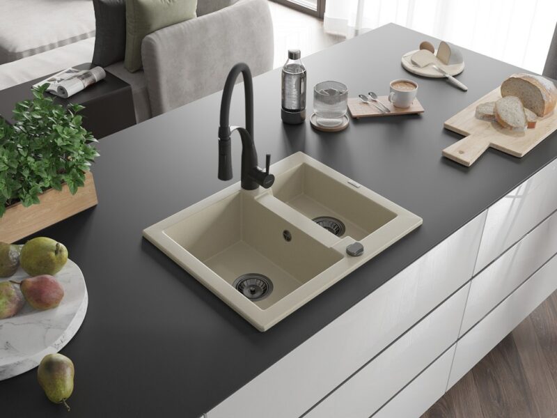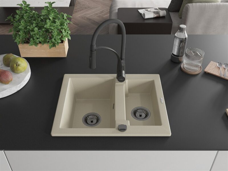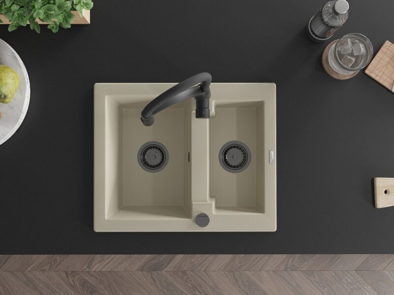 Technické dáta: drez: Rozmer: 582 x 475 x 177 mm Hĺbka komory: 162 mm (väčšia), 102 mm (menšia) Rozmery komory: 395×272 mm (väčšie), 375×182 mm (menšie) Priemer odtoku: ø90 mm Typ: 1,5 komory Typ: Zapustené do pracovnej dosky Farba béžová Povrchová úprava sifónu: čierna Materiál: žula (80% žulové kamenivo, 20% živice) Prepadový otvor: Áno Otvory: (batérie, automatické) 2 Vysoká odolnosť proti poškriabaniu a zmene farby Odolnosť proti tepelným šokom Ľahko čistiteľný povrch Jeden dodatočný vyfrézovaný otvor na samodierovanie ø35 kuchynská batéria: Materiál: mosadz Čierna farba Hlava: Keramická Prevzdušňovač: Áno Typ: Jedna páka Výška batérie: 430 mm Rozsah výtoku: 185 mm Batéria má výsuvný výtok(GT) Ean: 5905315048929