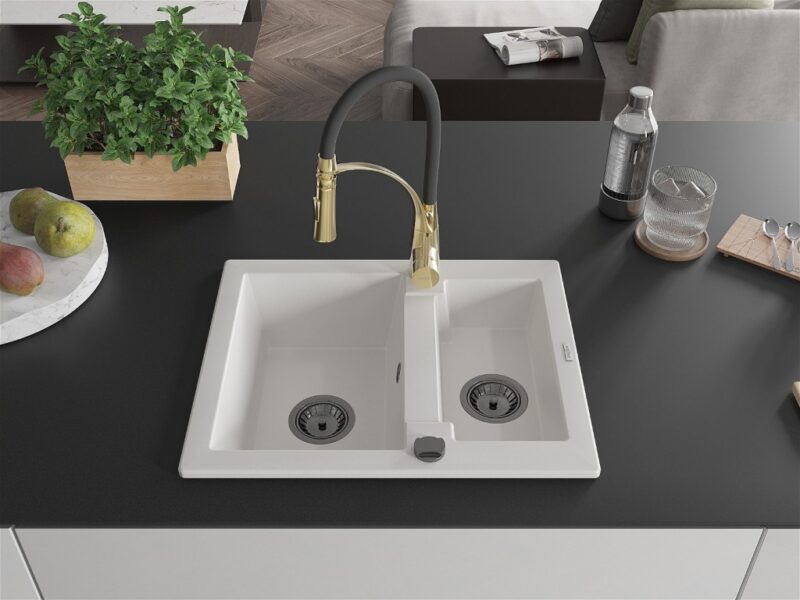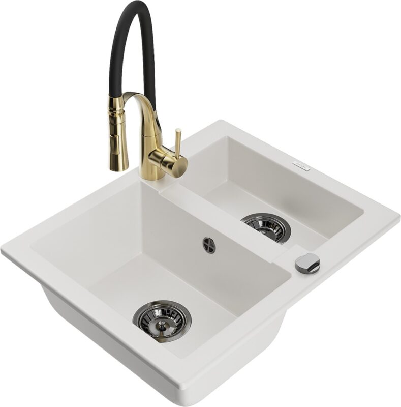Technické dáta: drez: Rozmer: 582 x 475 x 177 mm Hĺbka komory: 162 mm (väčšia), 102 mm (menšia) Rozmery komory: 395×272 mm (väčšie), 375×182 mm (menšie) Priemer odtoku: ø90 mm Typ: 1,5 komory Typ: Zapustené do pracovnej dosky biela farba Povrchová úprava sifónu: čierna Materiál: žula (80% žulové kamenivo, 20% živice) Prepadový otvor: Áno Otvory: (batérie, automatické) 2 Vysoká odolnosť proti poškriabaniu a zmene farby Odolnosť proti tepelným šokom Ľahko čistiteľný povrch Jeden dodatočný vyfrézovaný otvor na samodierovanie ø35 kuchynská batéria: Materiál: mosadz Farba: Zlatá/Čierna Hlava: Keramická Prevzdušňovač: Áno Typ: Jedna páka Výška batérie: 430 mm Rozsah výtoku: 185 mm Batéria má výsuvný výtok(GT) Ean: 5905315048851