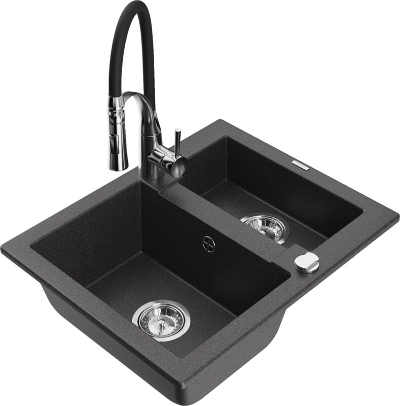 Technické dáta: Drez: Rozmer: 582x475x177 mm Hĺbka komory: 162 mm (väčšia), 102 mm (menšia) Rozmery komory: 395×272 mm (väčšie), 375×182 mm (menšie) Priemer odtoku: ø90 mm Typ: 1,5-komorový Typ: Zapustené do pracovnej dosky Farba: Škvrnitá čierna Povrchová úprava sifónu: Chrome Materiál: žula (80% žulové kamenivo 20% živice) Prepadový otvor: Áno Otvory: (batérie, automat) 2 Vysoká odolnosť proti poškriabaniu a zmene farby Odolnosť proti tepelným šokom Povrch pre ľahké čistenie Jeden dodatočný vyfrézovaný otvor na samodierovanie ø35 Kuchynská batéria: Materiál: mosadz Farba: chróm/čierna Hlava: Keramická Perlátor: Áno Typ výtoku: Flexibilný s mosadznou podperou Typ: Jednopákové Výška batérie: 430 mm Rozsah výtoku: 235 mm(GT) Ean: 5905315049124
