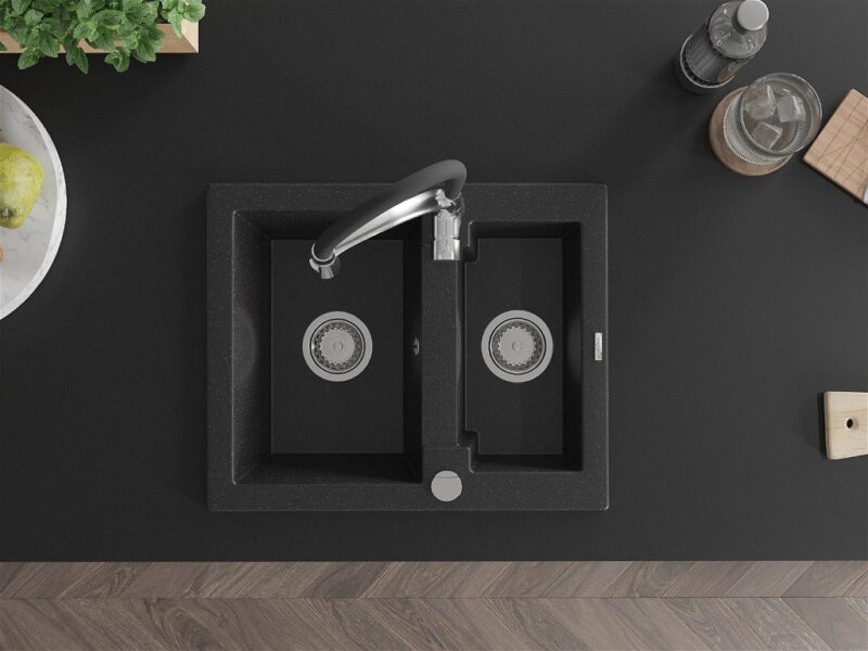 Technické dáta: Drez: Rozmer: 582x475x177 mm Hĺbka komory: 162 mm (väčšia), 102 mm (menšia) Rozmery komory: 395×272 mm (väčšie), 375×182 mm (menšie) Priemer odtoku: ø90 mm Typ: 1,5-komorový Typ: Zapustené do pracovnej dosky Farba: čierna/strieborná metalíza Povrchová úprava sifónu: Chrome Materiál: žula (80% žulové kamenivo 20% živice) Prepadový otvor: Áno Otvory: (batérie, automat) 2 Vysoká odolnosť proti poškriabaniu a zmene farby Odolnosť proti tepelným šokom Povrch pre ľahké čistenie Jeden dodatočný vyfrézovaný otvor na samodierovanie ø35 Kuchynská batéria: Materiál: mosadz Farba: chróm/čierna Hlava: Keramická Perlátor: Áno Typ výtoku: Flexibilný s mosadznou podperou Typ: Jednopákové Výška batérie: 430 mm Rozsah výtoku: 235 mm(GT) Ean: 5905315049001
