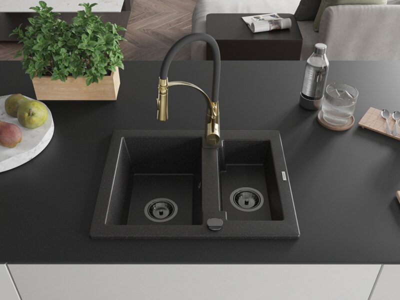 Technické dáta: Drez: Rozmer: 582x475x177 mm Hĺbka komory: 162 mm (väčšia), 102 mm (menšia) Rozmery komory: 395×272 mm (väčšie), 375×182 mm (menšie) Priemer odtoku: ø90 mm Typ: 1,5-komorový Typ: Zapustené do pracovnej dosky Farba: čierna/strieborná metalíza Povrchová úprava sifónu: čierna Materiál: žula (80% žulové kamenivo 20% živice) Prepadový otvor: Áno Otvory: (batérie, automat) 2 Vysoká odolnosť proti poškriabaniu a zmene farby Odolnosť proti tepelným šokom Povrch pre ľahké čistenie Jeden dodatočný vyfrézovaný otvor na samodierovanie ø35 Kuchynská batéria: Materiál: mosadz Farba: Zlatá/Čierna Hlava: Keramická Perlátor: Áno Typ výtoku: Flexibilný s mosadznou podperou Typ: Jednopákové Výška batérie: 430 mm Rozsah výtoku: 235 mm(GT) Ean: 5905315049032