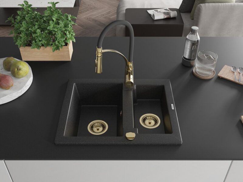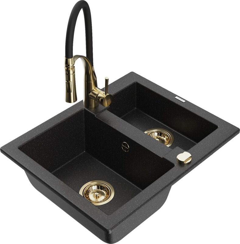 Technické dáta: Drez: Rozmer: 582x475x177 mm Hĺbka komory: 162 mm (väčšia), 102 mm (menšia) Rozmery komory: 395×272 mm (väčšie), 375×182 mm (menšie) Priemer odtoku: ø90 mm Typ: 1,5-komorový Typ: Zapustené do pracovnej dosky Farba: čierna/strieborná metalíza Povrchová úprava sifónu: zlatá Materiál: žula (80% žulové kamenivo 20% živice) Prepadový otvor: Áno Otvory: (batérie, automat) 2 Vysoká odolnosť proti poškriabaniu a zmene farby Odolnosť proti tepelným šokom Povrch pre ľahké čistenie Jeden dodatočný vyfrézovaný otvor na samodierovanie ø35 Kuchynská batéria: Materiál: mosadz Farba: Zlatá/Čierna Hlava: Keramická Perlátor: Áno Typ výtoku: Flexibilný s mosadznou podperou Typ: Jednopáková Výška batérie: 430 mm Rozsah výtoku: 235 mm(GT) Ean: 5905315049025