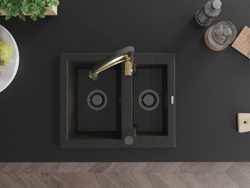 Technické dáta: drez: Rozmer: 582 x 475 x 177 mm Hĺbka komory: 162 mm (väčšia), 102 mm (menšia) Rozmery komory: 395×272 mm (väčšie), 375×182 mm (menšie) Priemer odtoku: ø90 mm Typ: 1,5 komory Typ: Zapustené do pracovnej dosky Farba: čierna / zlatá metalíza Povrchová úprava sifónu: čierna Materiál: žula (80% žulové kamenivo, 20% živice) Prepadový otvor: Áno Otvory: (batérie, automatické) 2 Vysoká odolnosť proti poškriabaniu a zmene farby Odolnosť proti tepelným šokom Ľahko čistiteľný povrch Jeden dodatočný vyfrézovaný otvor na samodierovanie ø35 kuchynská batéria: Materiál: mosadz Farba: Zlatá/Čierna Hlava: Keramická Prevzdušňovač: Áno Typ: Jedna páka Výška batérie: 430 mm Rozsah výtoku: 185 mm Batéria má výsuvný výtok(GT) Ean: 5905315049094