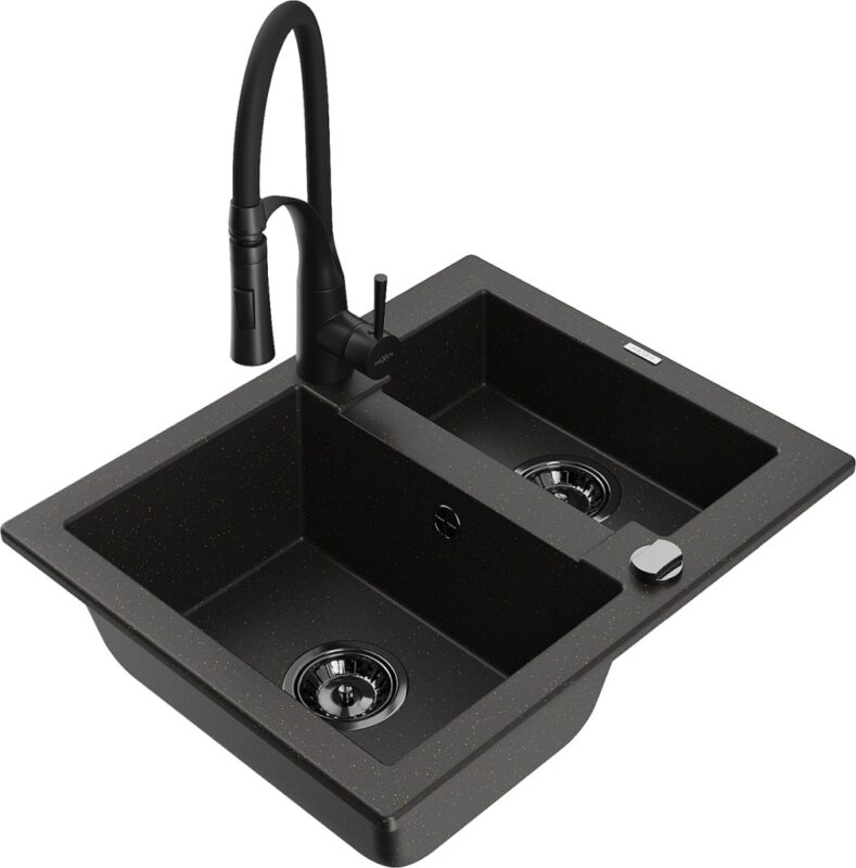 Technické dáta: drez: Rozmer: 582 x 475 x 177 mm Hĺbka komory: 162 mm (väčšia), 102 mm (menšia) Rozmery komory: 395×272 mm (väčšie), 375×182 mm (menšie) Priemer odtoku: ø90 mm Typ: 1,5 komory Typ: Zapustené do pracovnej dosky Farba: čierna / zlatá metalíza Povrchová úprava sifónu: čierna Materiál: žula (80% žulové kamenivo, 20% živice) Prepadový otvor: Áno Otvory: (batérie, automatické) 2 Vysoká odolnosť proti poškriabaniu a zmene farby Odolnosť proti tepelným šokom Ľahko čistiteľný povrch Jeden dodatočný vyfrézovaný otvor na samodierovanie ø35 kuchynská batéria: Materiál: mosadz Čierna farba Hlava: Keramická Prevzdušňovač: Áno Typ: Jedna páka Výška batérie: 430 mm Rozsah výtoku: 185 mm Batéria má výsuvný výtok(GT) Ean: 5905315049100