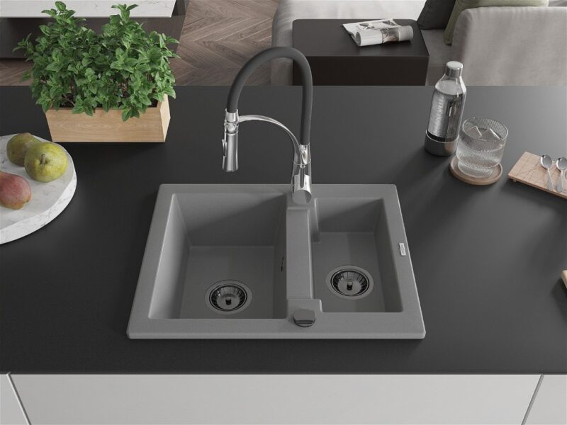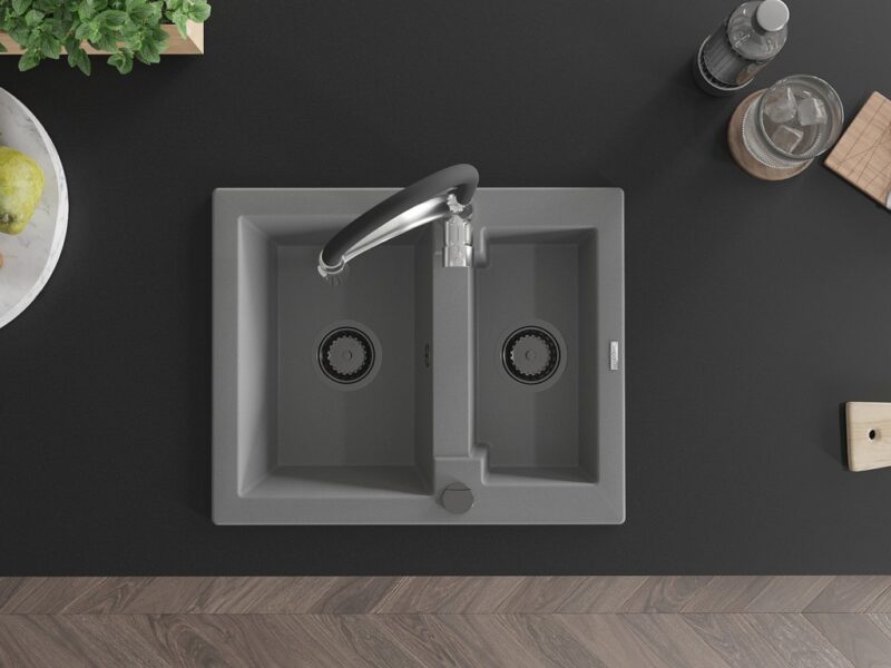Technické dáta: drez: Rozmer: 582 x 475 x 177 mm Hĺbka komory: 162 mm (väčšia), 102 mm (menšia) Rozmery komory: 395×272 mm (väčšie), 375×182 mm (menšie) Priemer odtoku: ø90 mm Typ: 1,5 komory Typ: Zapustené do pracovnej dosky Šedá farba Povrchová úprava sifónu: čierna Materiál: žula (80% žulové kamenivo, 20% živice) Prepadový otvor: Áno Otvory: (batérie, automatické) 2 Vysoká odolnosť proti poškriabaniu a zmene farby Odolnosť proti tepelným šokom Ľahko čistiteľný povrch Jeden dodatočný vyfrézovaný otvor na samodierovanie ø35 kuchynská batéria: Materiál: mosadz Farba: chróm/čierna Hlava: Keramická Prevzdušňovač: Áno Typ: Jedna páka Výška batérie: 430 mm Rozsah výtoku: 185 mm Batéria má výsuvný výtok(GT) Ean: 5905315048950