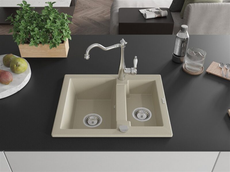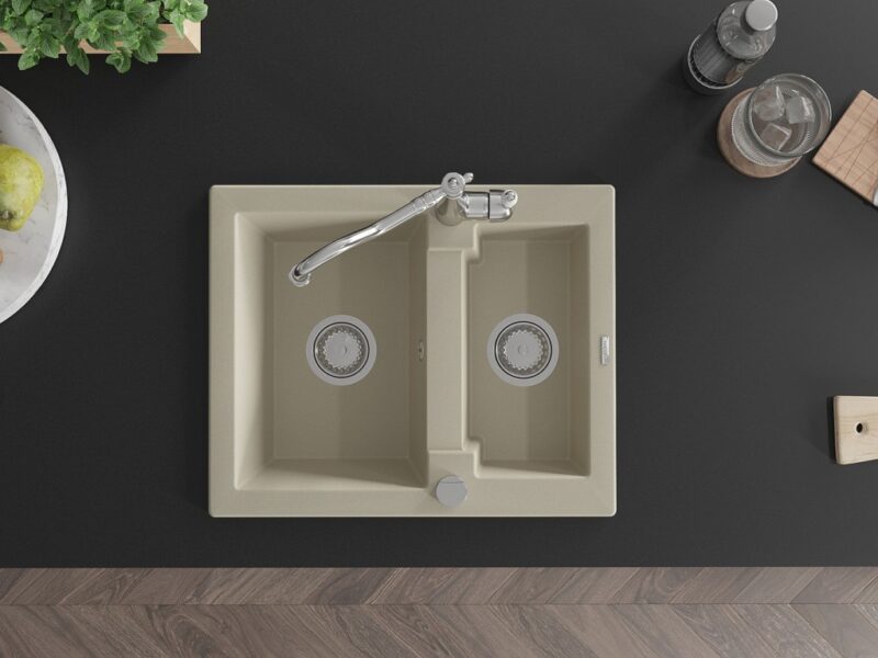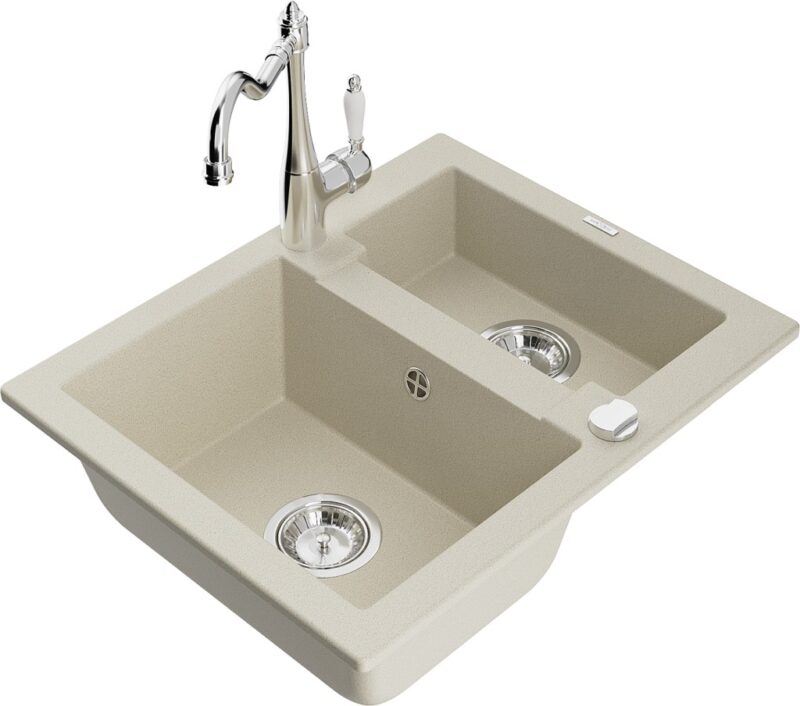 Technické dáta: drez: Rozmer: 582 x 475 x 177 mm Hĺbka komory: 162 mm (väčšia), 102 mm (menšia) Rozmery komory: 395×272 mm (väčšie), 375×182 mm (menšie) Priemer odtoku: ø90 mm Typ: 1,5 komory Typ: Zapustené do pracovnej dosky Farba béžová Povrchová úprava sifónu: Chrome Materiál: žula (80% žulové kamenivo, 20% živice) Prepadový otvor: Áno Otvory: (batérie, automatické) 2 Vysoká odolnosť proti poškriabaniu a zmene farby Odolnosť proti tepelným šokom Ľahko čistiteľný povrch Jeden dodatočný vyfrézovaný otvor na samodierovanie ø35 kuchynská batéria: Materiál: mosadz Farba: Chrome Hlava: Keramická Prevzdušňovač: Áno Typ: Jedna páka Výška batérie: 290 mm Rozsah výtoku: 260 mm(GT) Ean: 5905315042231