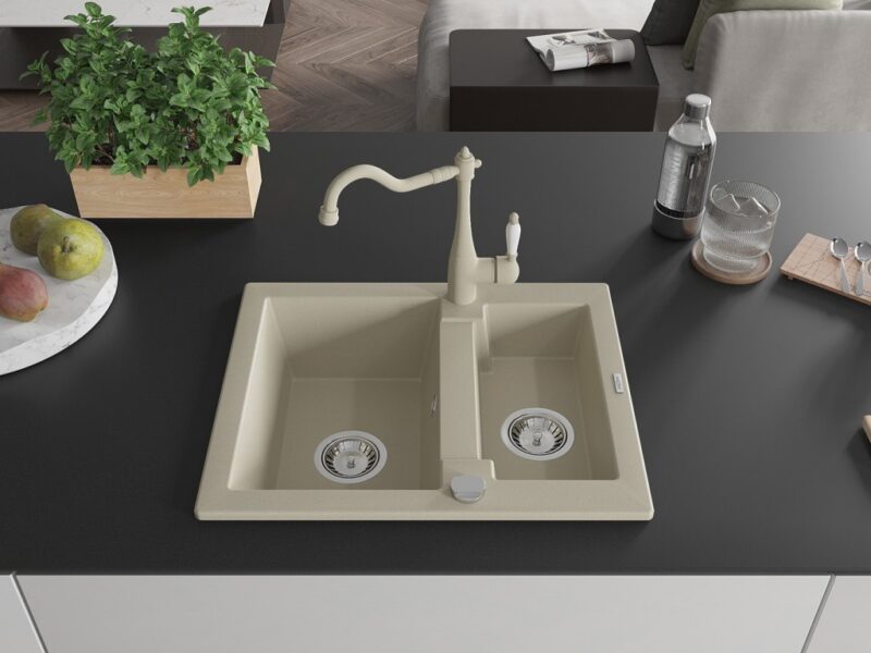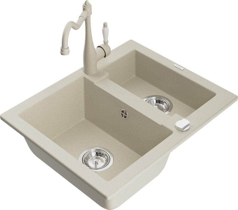 Technické dáta: drez: Rozmer: 582 x 475 x 177 mm Hĺbka komory: 162 mm (väčšia), 102 mm (menšia) Rozmery komory: 395×272 mm (väčšie), 375×182 mm (menšie) Priemer odtoku: ø90 mm Typ: 1,5 komory Typ: Zapustené do pracovnej dosky Farba béžová Povrchová úprava sifónu: Chrome Materiál: žula (80% žulové kamenivo, 20% živice) Prepadový otvor: Áno Otvory: (batérie, automatické) 2 Vysoká odolnosť proti poškriabaniu a zmene farby Odolnosť proti tepelným šokom Ľahko čistiteľný povrch Jeden dodatočný vyfrézovaný otvor na samodierovanie ø35 kuchynská batéria: Materiál: mosadz Farba béžová Hlava: Keramická Prevzdušňovač: Áno Typ: Jedna páka Výška batérie: 290 mm Rozsah výtoku: 260 mm(GT) Ean: 5905315042248