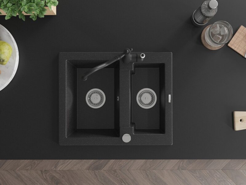 Technické dáta: Drez: Rozmer: 582x475x177 mm Hĺbka komory: 162 mm (väčšia), 102 mm (menšia) Rozmery komory: 395×272 mm (väčšie), 375×182 mm (menšie) Priemer odtoku: ø90 mm Typ: 1,5-komorový Typ: Zapustené do pracovnej dosky Farba: čierna/strieborná metalíza Povrchová úprava sifónu: Chrome Materiál: žula (80% žulové kamenivo 20% živice) Prepadový otvor: Áno Otvory: (batérie, automat) 2 Vysoká odolnosť proti poškriabaniu a zmene farby Odolnosť proti tepelným šokom Povrch pre ľahké čistenie Jeden dodatočný vyfrézovaný otvor na samodierovanie ø35 Kuchynská batéria: Materiál: mosadz Čierna farba Hlava: Keramická Perlátor: Áno Typ: Jednopákové Výška batérie: 290 mm Rozsah výtoku: 260 mm(GT) Ean: 5905315042347