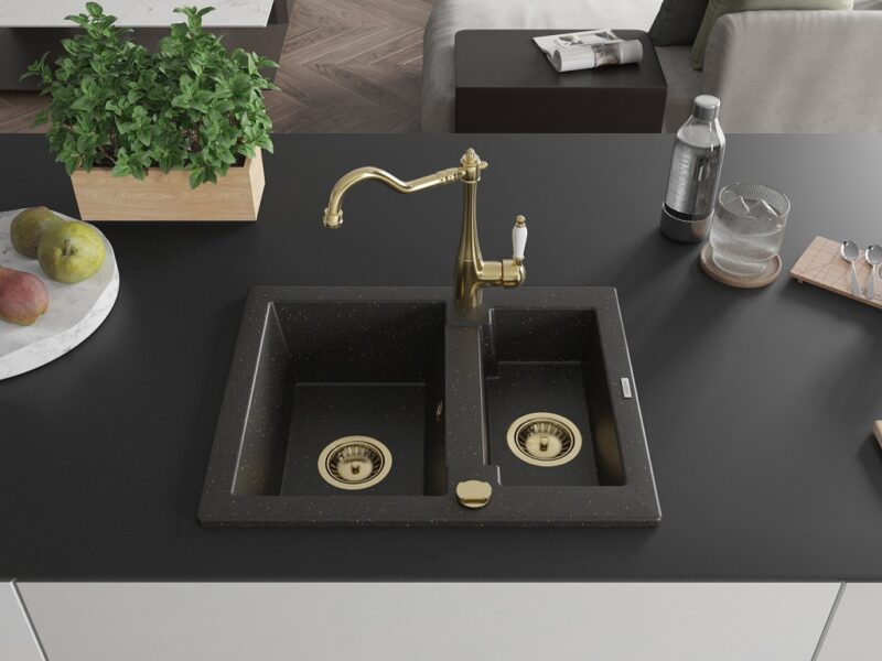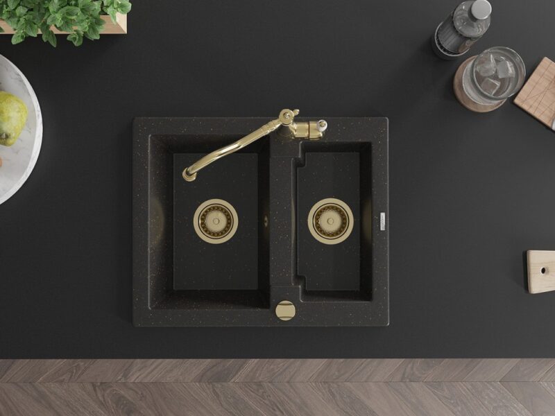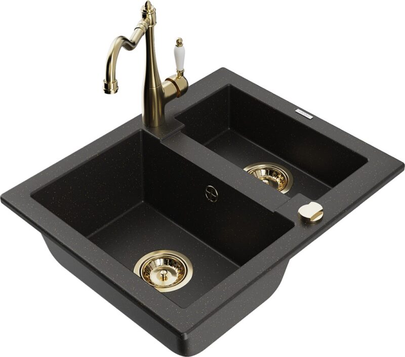 Technické dáta: drez: Rozmer: 582 x 475 x 177 mm Hĺbka komory: 162 mm (väčšia), 102 mm (menšia) Rozmery komory: 395×272 mm (väčšie), 375×182 mm (menšie) Priemer odtoku: ø90 mm Typ: 1,5 komory Typ: Zapustené do pracovnej dosky Farba: čierna / zlatá metalíza Povrchová úprava sifónu: zlatá Materiál: žula (80% žulové kamenivo, 20% živice) Prepadový otvor: Áno Otvory: (batérie, automatické) 2 Vysoká odolnosť proti poškriabaniu a zmene farby Odolnosť proti tepelným šokom Ľahko čistiteľný povrch Jeden dodatočný vyfrézovaný otvor na samodierovanie ø35 kuchynská batéria: Materiál: mosadz Farba: Zlatá Hlava: Keramická Prevzdušňovač: Áno Typ: Jedna páka Výška batérie: 290 mm Rozsah výtoku: 260 mm(GT) Ean: 5905315042378