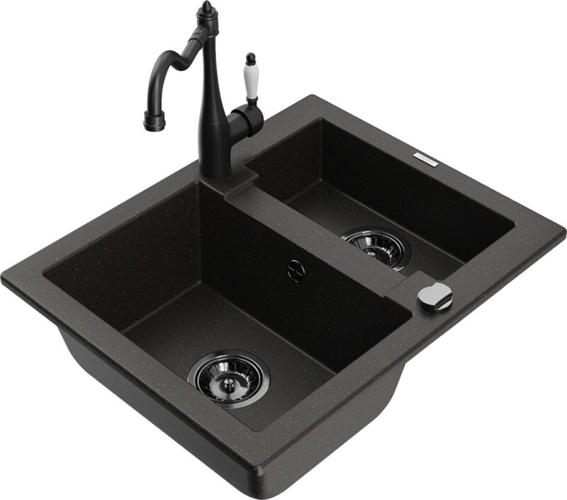 Technické dáta: drez: Rozmer: 582 x 475 x 177 mm Hĺbka komory: 162 mm (väčšia), 102 mm (menšia) Rozmery komory: 395×272 mm (väčšie), 375×182 mm (menšie) Priemer odtoku: ø90 mm Typ: 1,5 komory Typ: Zapustené do pracovnej dosky Farba: čierna / zlatá metalíza Povrchová úprava sifónu: čierna Materiál: žula (80% žulové kamenivo, 20% živice) Prepadový otvor: Áno Otvory: (batérie, automatické) 2 Vysoká odolnosť proti poškriabaniu a zmene farby Odolnosť proti tepelným šokom Ľahko čistiteľný povrch Jeden dodatočný vyfrézovaný otvor na samodierovanie ø35 kuchynská batéria: Materiál: mosadz Čierna farba Hlava: Keramická Prevzdušňovač: Áno Typ: Jedna páka Výška batérie: 290 mm Rozsah výtoku: 260 mm(GT) Ean: 5905315042408