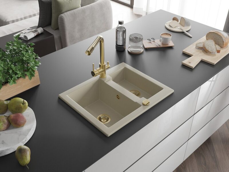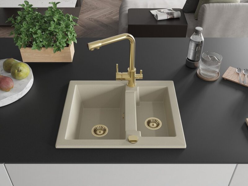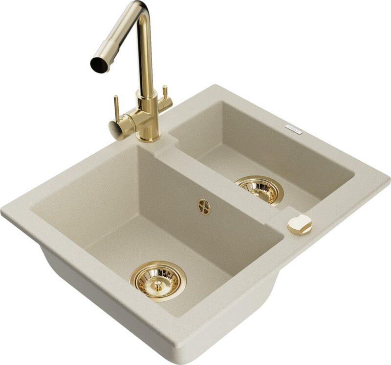 Technické dáta: Drez: Rozmer: 582x475x177 mm Hĺbka komory: 162 mm (väčšia), 102 mm (menšia) Rozmery komory: 395×272 mm (väčšie), 375×182 mm (menšie) Priemer odtoku: ø90 mm Typ: 1,5-komorový Typ: Zapustené do pracovnej dosky Farba béžová Povrchová úprava sifónu: zlatá Materiál: žula (80% žulové kamenivo 20% živice) Prepadový otvor: Áno Otvory: (batérie, automat) 2 Vysoká odolnosť proti poškriabaniu a zmene farby Odolnosť proti tepelným šokom Povrch pre ľahké čistenie Jeden dodatočný vyfrézovaný otvor na samodierovanie ø35 Kuchynská batéria: Materiál: mosadz Farba: Zlatá Hlava: Keramická Perlátor: Áno Typ: Dve rukoväte Rozsah výtoku: 235 mm Výška batérie: 315 mm Dvojhlavá batéria s prídavným filtrom na pitnú vodu(GT) Ean: 5905315026873